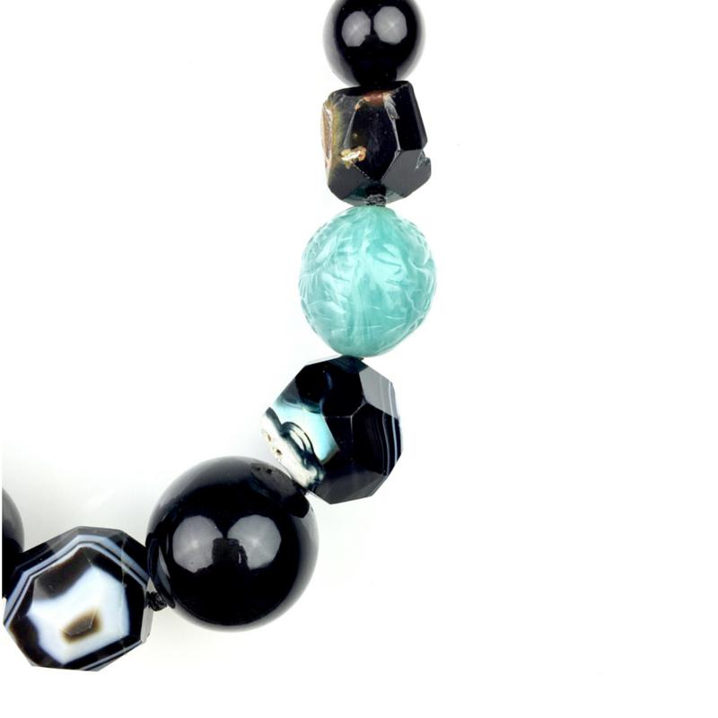 This is a 36-inch hand-knotted necklace. It features Dyed Faceted Agate and Vintage Resin Beads with a gunmetal toggle clasp.