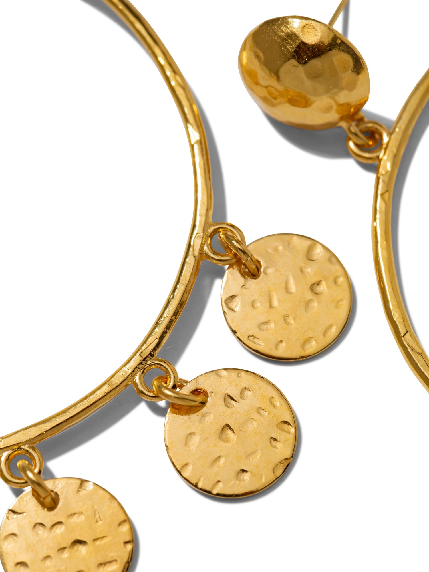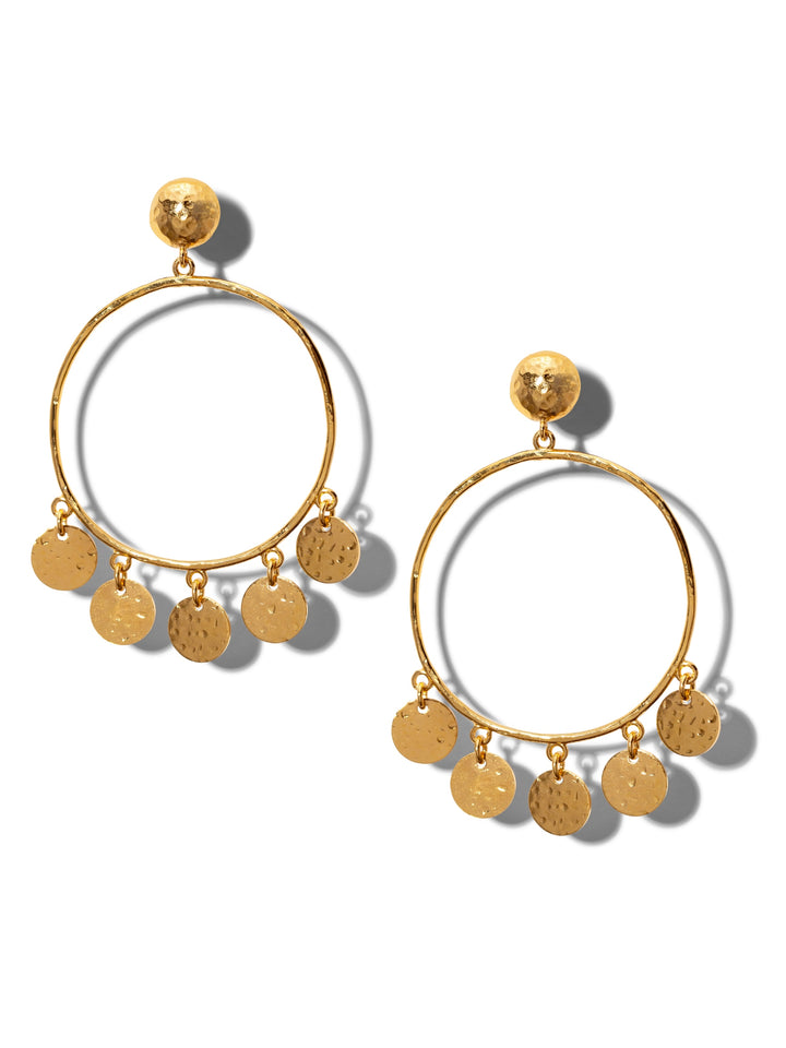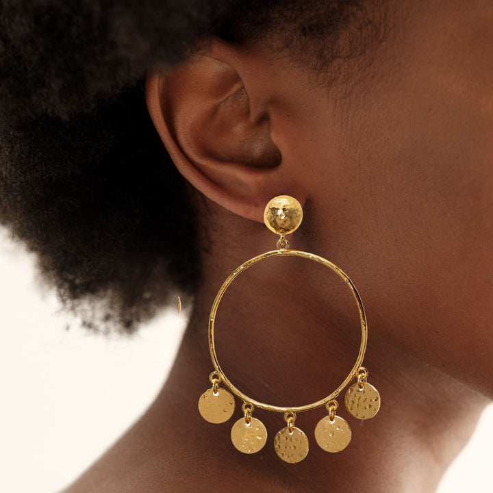These Gold Fortuna Chandelier Earrings by Jaredjamin are a beautiful and opulent statement piece. The "hammered-to-sparkle" texture of the chandelier hoops, along with their textured coin charms, creates a luminous and captivating effect. They are a perfect example of "understated opulence," designed to add dramatic, rich style to any outfit. The lightweight design and E-coated finish ensure they are both comfortable and durable, ready to sparkle for years to come.