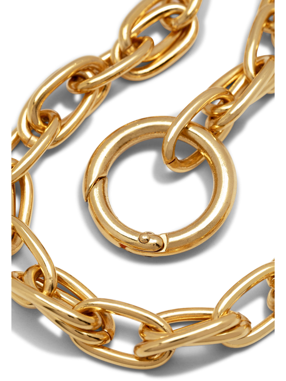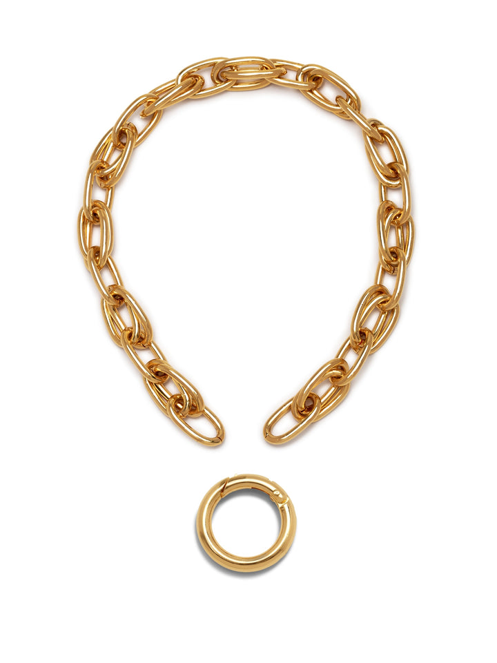 This chain necklace is made of 18K Gold Plated Brass. It features a chunky oval link design with an oversized circular detachable clasp.