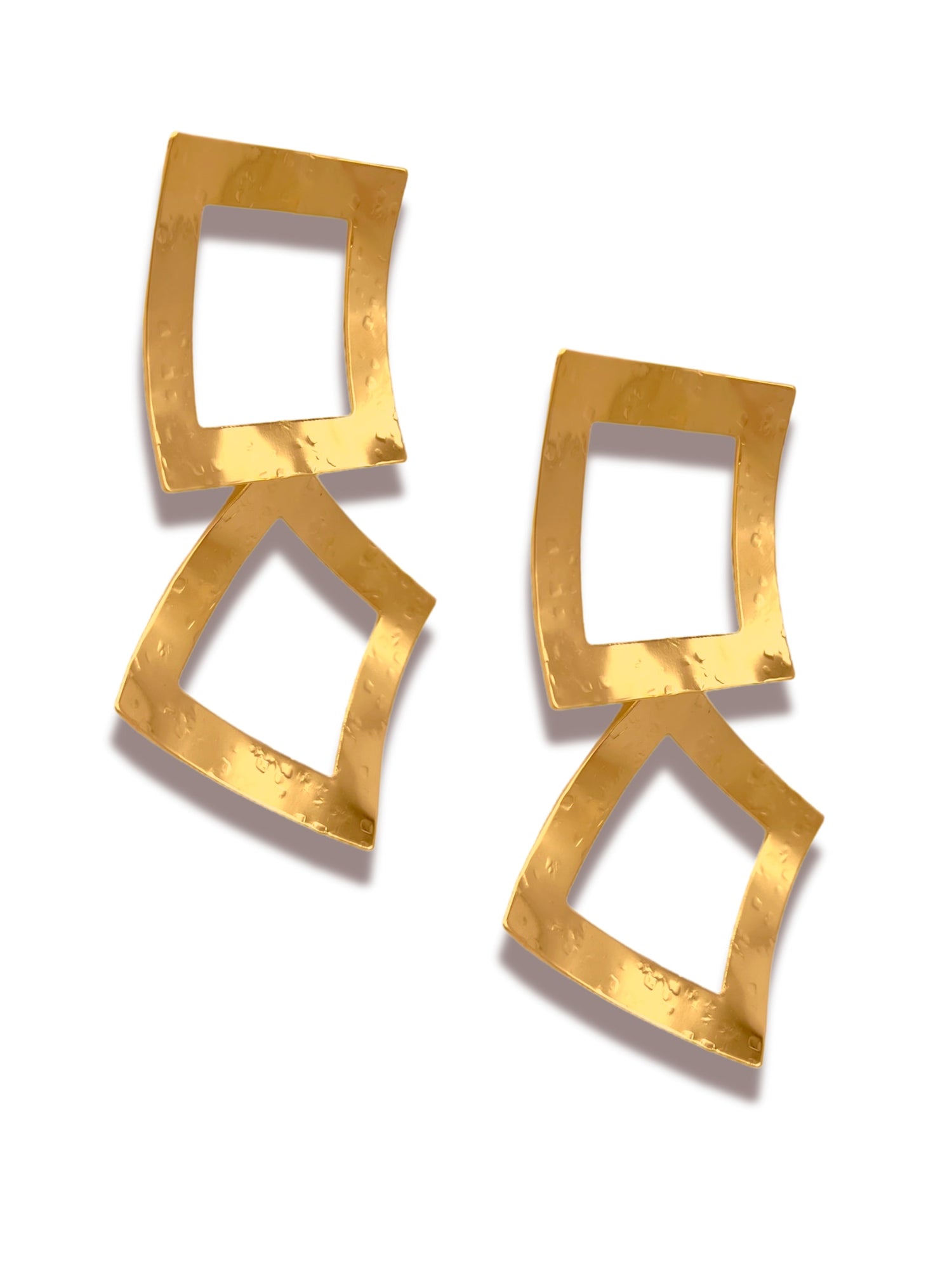These dangle earrings are crafted with solid brass and are 18k gold-plated with a textured finish and a protective e-coat. They measure 4.5 inches and weigh 19 grams.