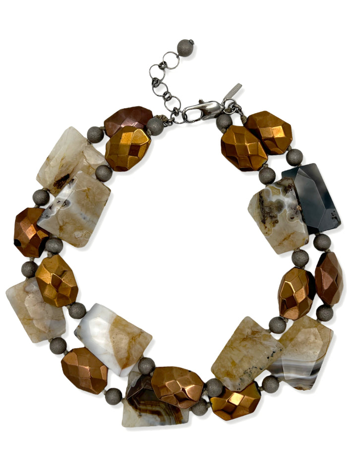 The Rocky Mountain Necklace by Jaredjamin is a beaded necklace that features a blend of natural textures and reflective surfaces. This 21-inch necklace is made with agate, crystals, and chrome-plated beads, and features a secure lobster clasp. The silver-cut gemstones have swirling sedimentary deposits that enhance their depth and texture.