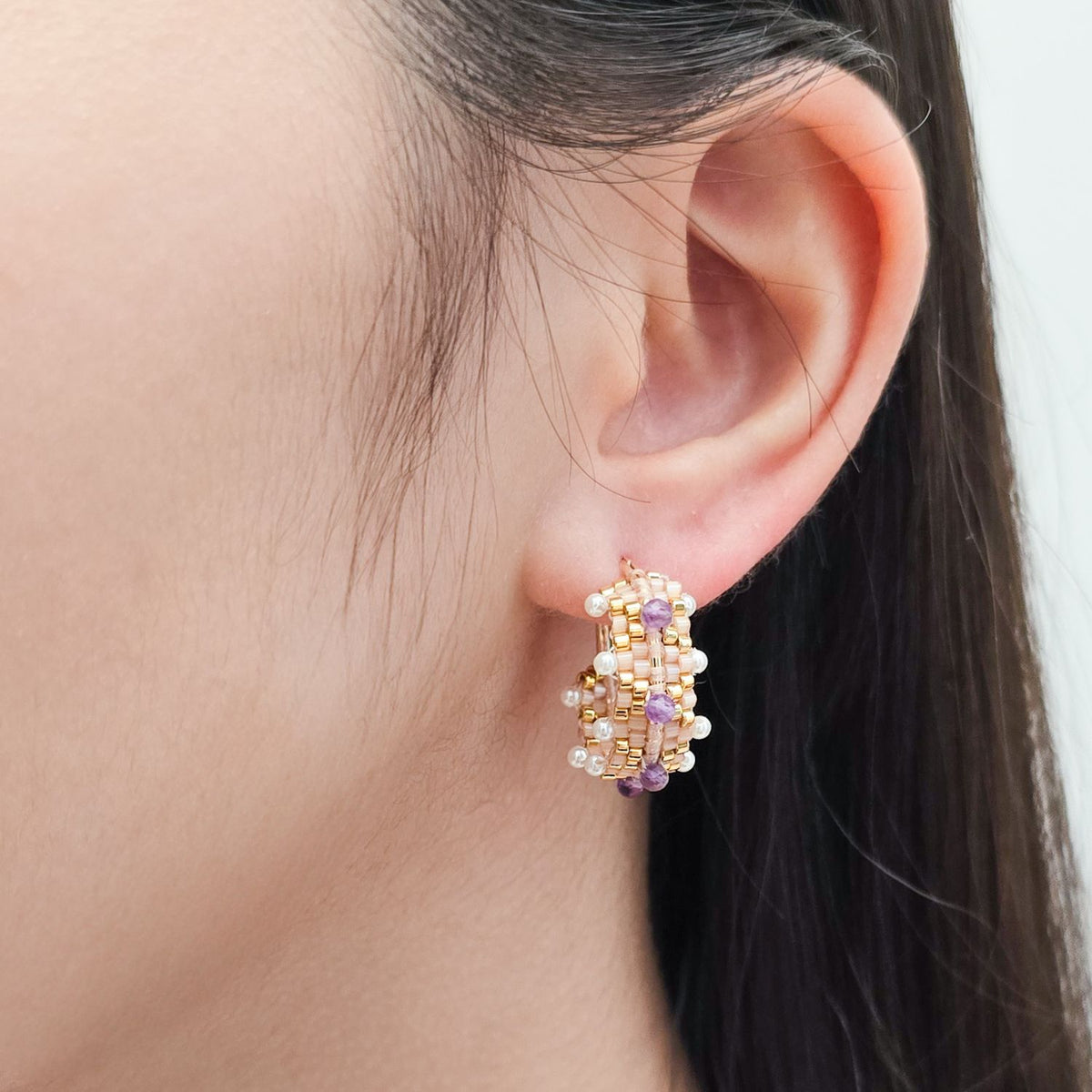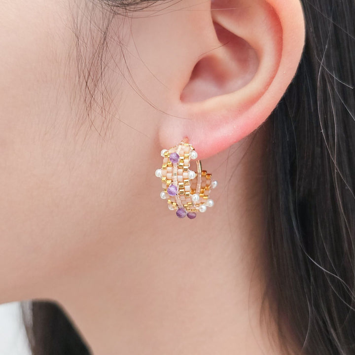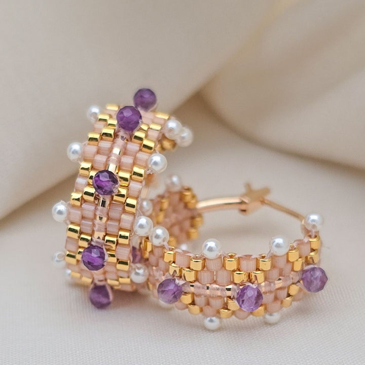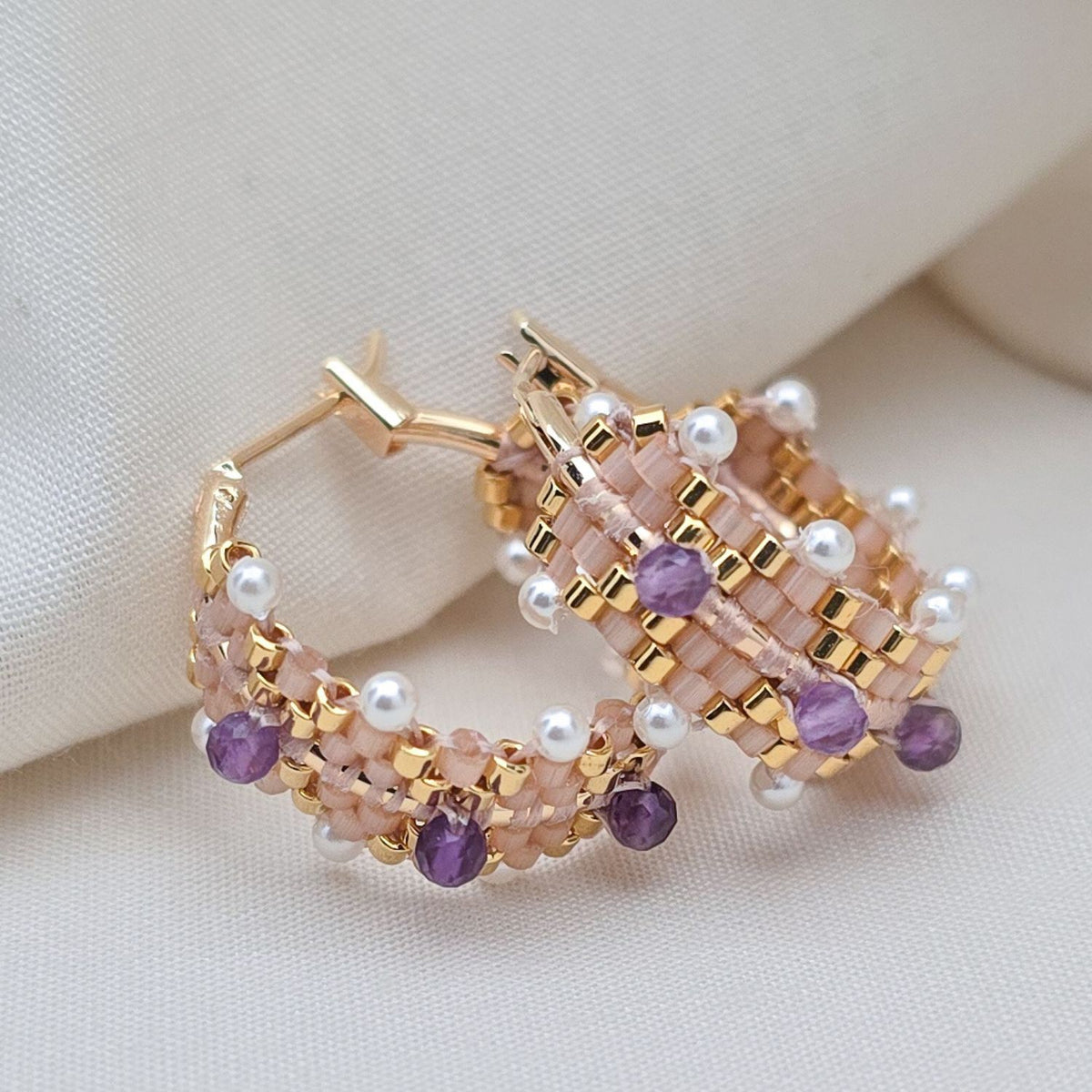 These hoops are made with 24k gold-plated beads, pearls, and semi-precious amethyst.
