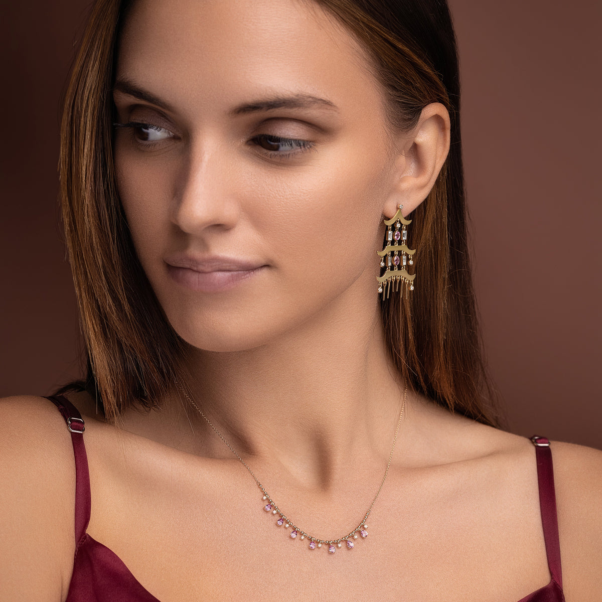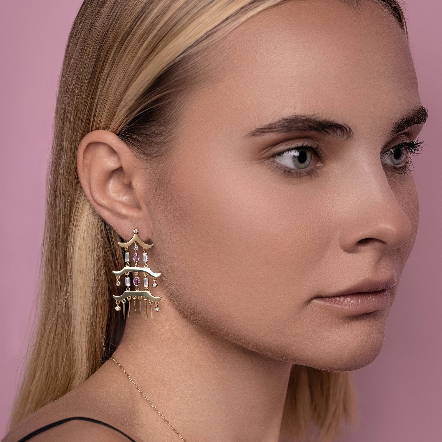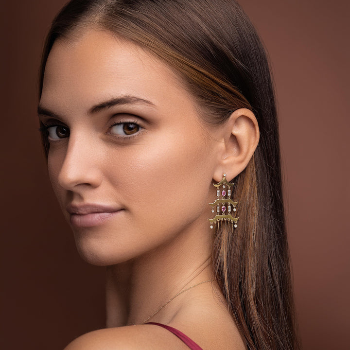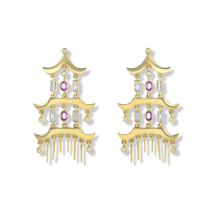 Style Notes: These Pink Sapphire Pagoda Earrings by Jewelbird are a unique, luxurious, and award-winning statement piece. Chosen for the Artist Exhibit at Milano Jewelry Week and featured in Vogue, these pagoda-shaped earrings are a true work of art. Rendered in 14k yellow gold and set with diamonds and pink and white sapphires, they are a glamorous accessory that symbolizes high-end sophistication and style.