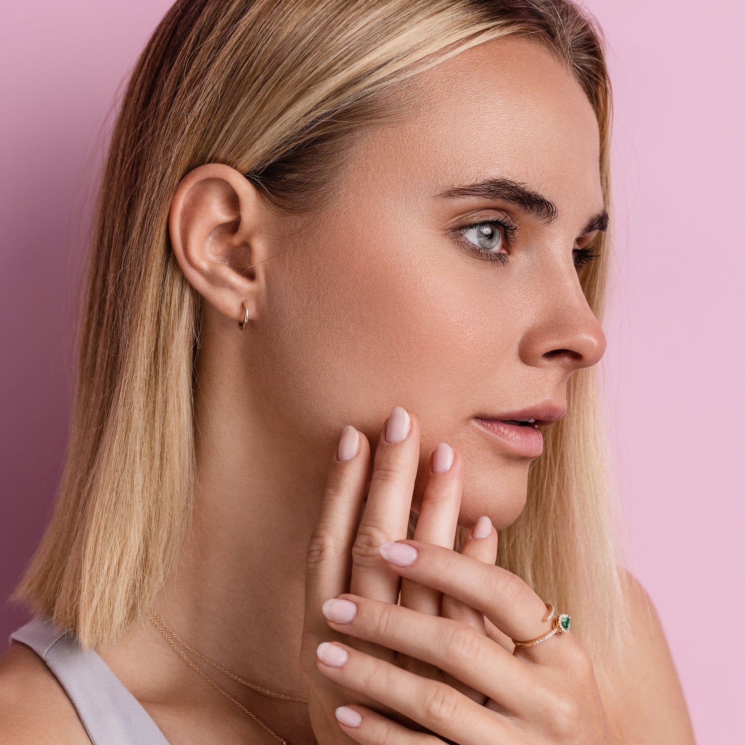 These Medium Hinged Hoop Huggies by Jewelbird are a classic and versatile pair of earrings. Made from solid 14k yellow gold, these medium-width huggie hoops have a hinged design for comfort and are perfect for stacking with other earrings. They are a timeless accessory designed with the highest quality standards.