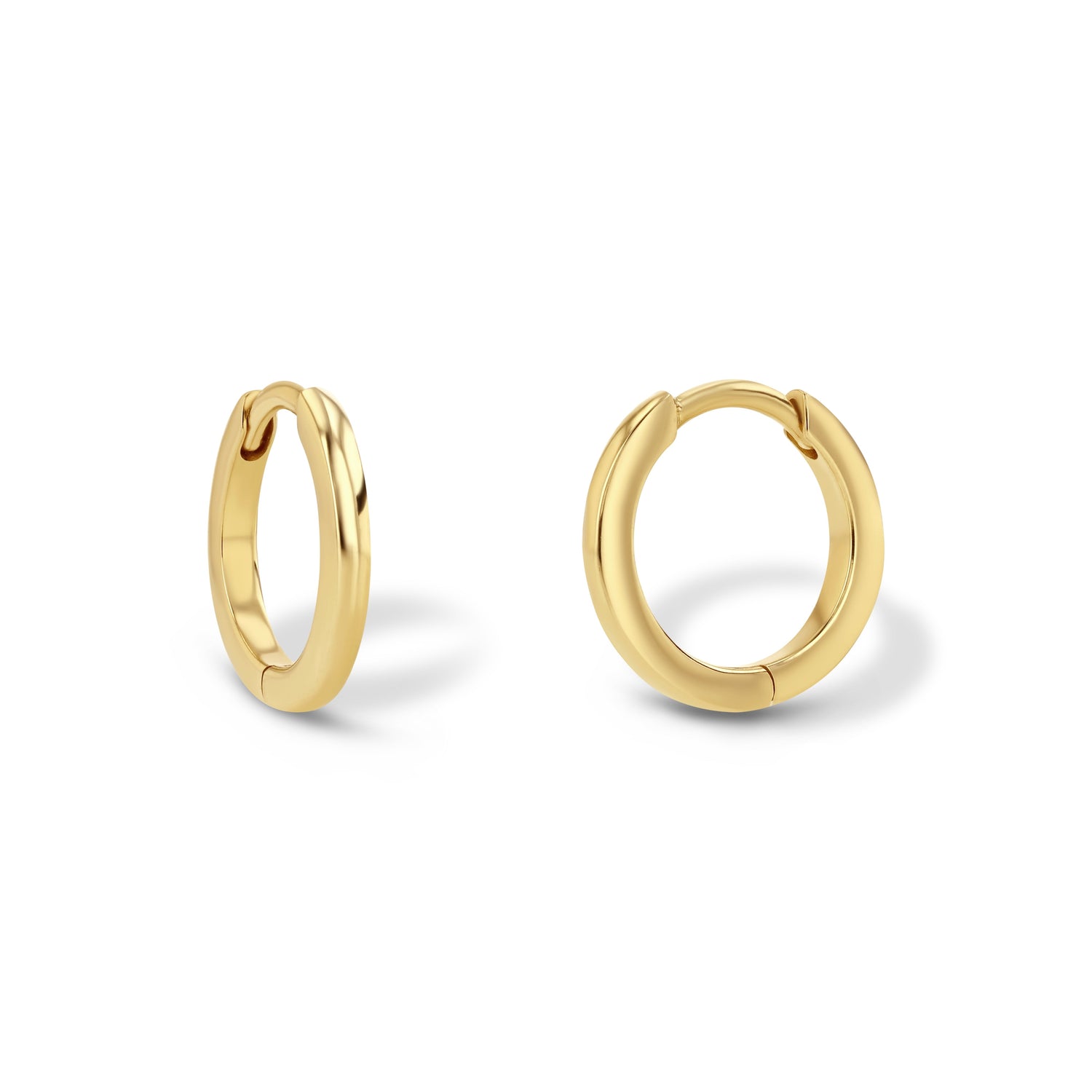 These huggie hoops are made from solid 14-karat yellow gold. They have a 9mm inner diameter and a width of 1.65mm.