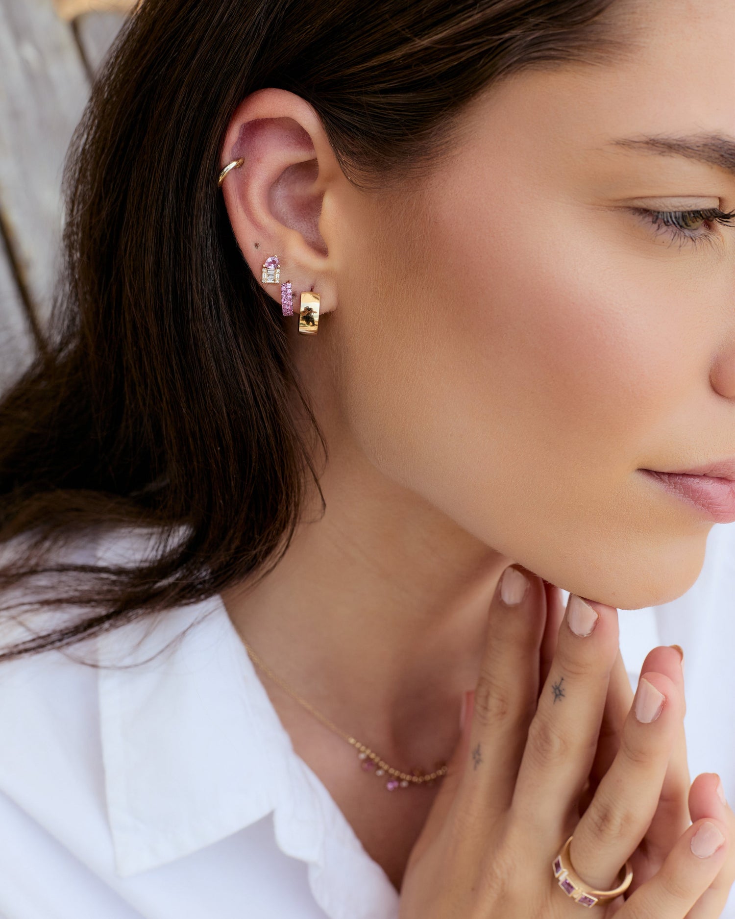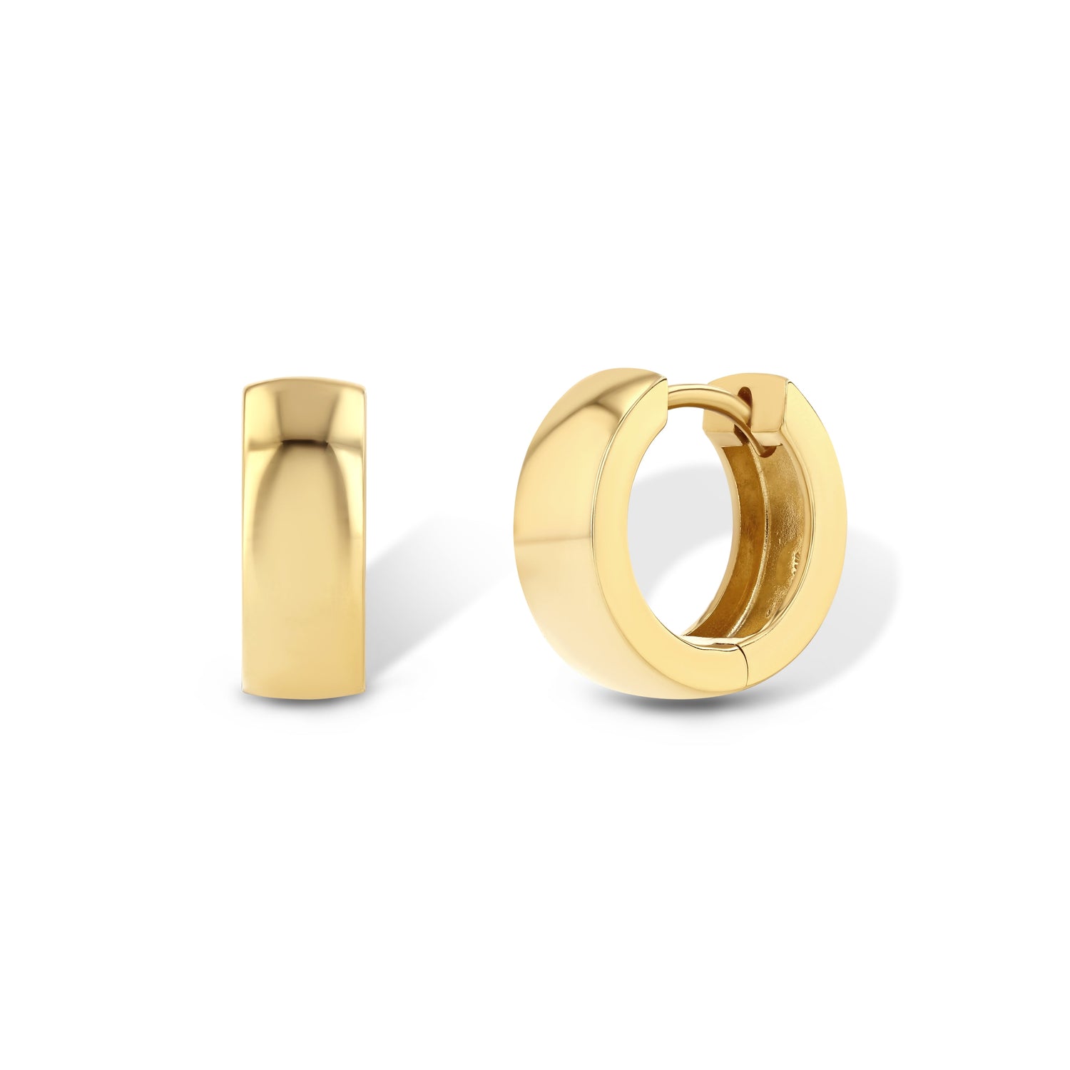 The Wide Hinged Hoop Huggies by Jewelbird are a classic and versatile accessory. Made from solid 14k yellow gold, these chunky hoops sit close to the ear, making them perfect for everyday wear. They pair well with other stud earrings or necklaces, providing a timeless and sophisticated look.