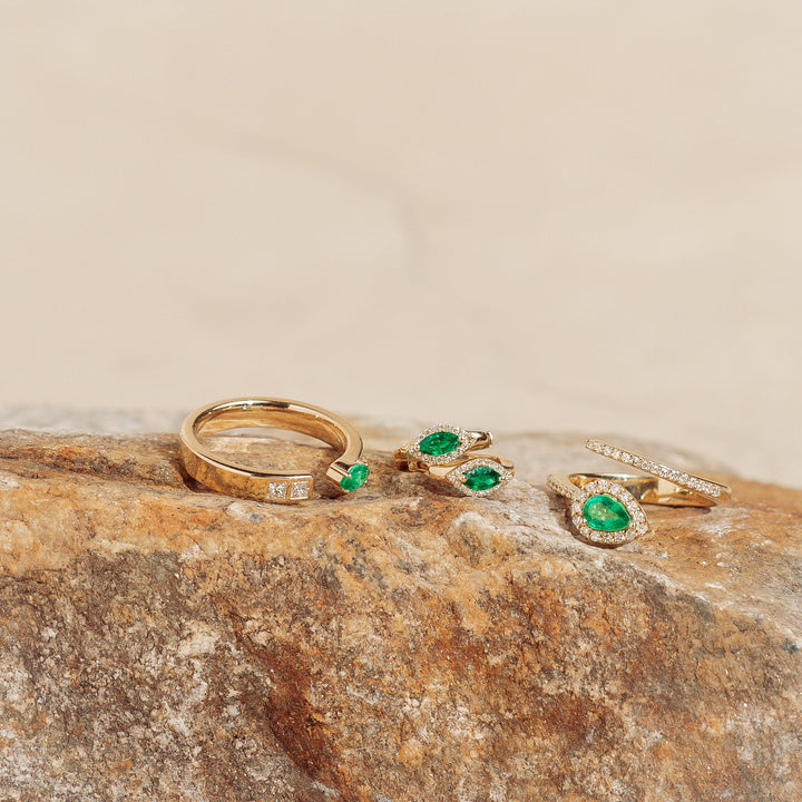 This Marquise Emerald & Diamond Ring by Jewelbird is a celebration of unique elegance. The split-shank, 14k gold band cradles a stunning marquise emerald, with two flush-set diamonds adding a subtle sparkle. The design is both modern and timeless, allowing the vibrant green of the emerald to stand out with sophisticated charm. Perfect for stacking with other rings from the Jewelbird collection, this piece is a testament to individuality and refined taste.