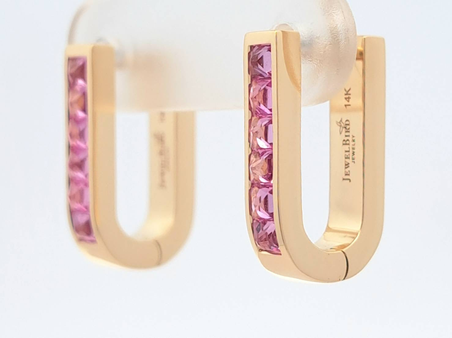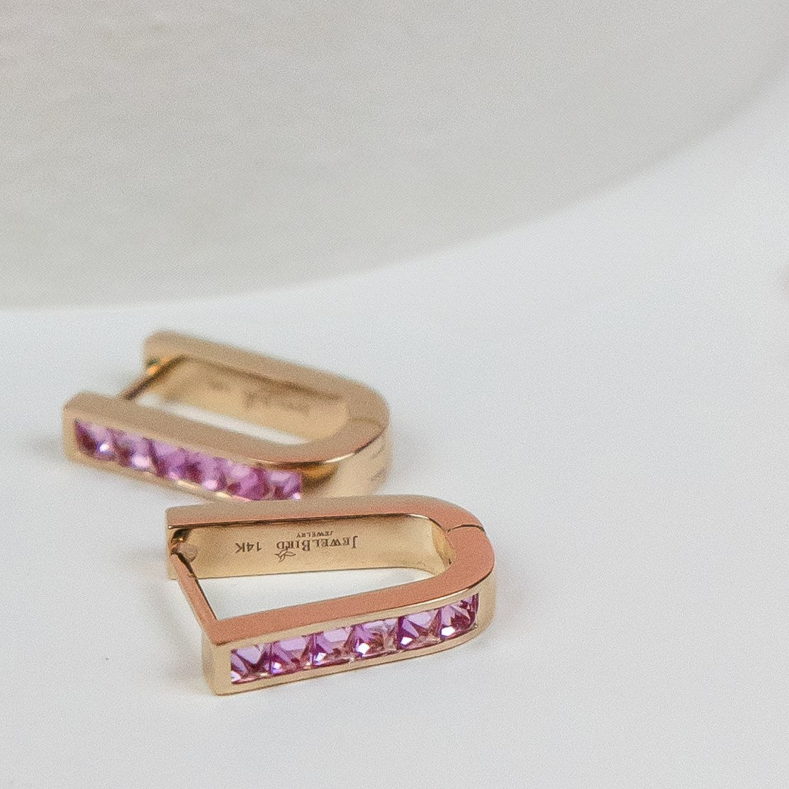 These Pink Sapphire U-Shaped Earrings by Jewelbird are a chic and contemporary choice. The u-shaped silhouette is a modern twist, while the reverse-set, princess-cut pink sapphires add an unexpected and striking detail. The vibrant hue of the sapphires lends a playful yet luxurious feel, making these earrings an effortless way to add a pop of color and architectural elegance to your style.