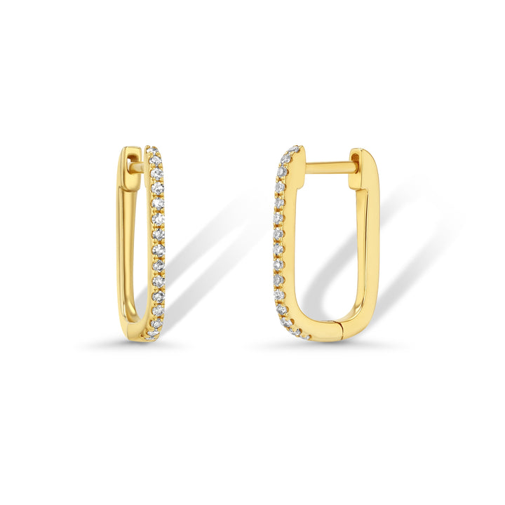 Crafted from 14k yellow gold, these huggie earrings feature 30 round pave diamonds (~0.105 ctw). They measure 15mm x 10mm.