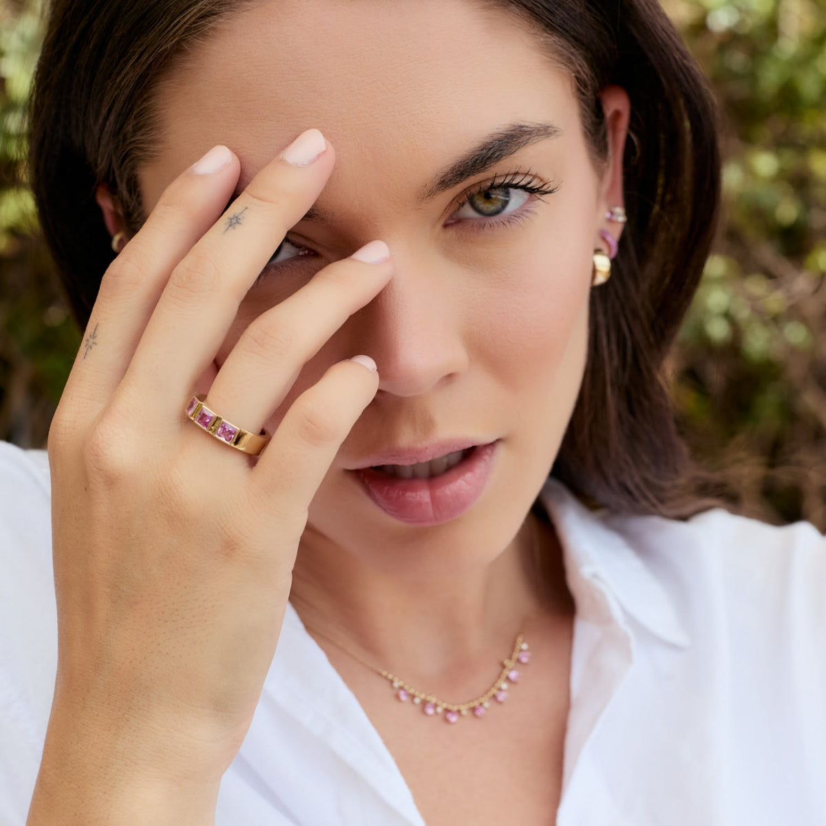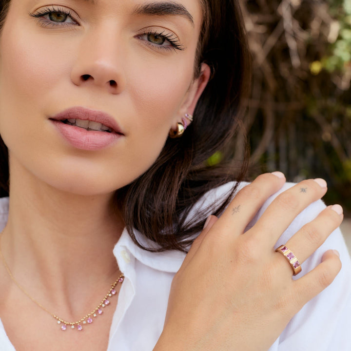 This Pink Sapphire Band Ring by Jewelbird is a true statement piece. The three princess-cut pink sapphires are vibrant and eye-catching, creating a bold, luxurious look. With its substantial weight and rich color, this ring is a beautiful symbol of confidence and style. It is designed to be cherished, whether worn alone or as part of a layered look.