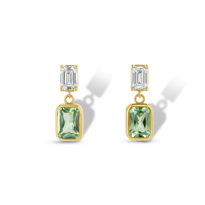 Crafted from 14k yellow gold, these earrings feature two emerald-cut lab diamonds (~1/2 ct each) and two radiant-cut natural mint tourmalines. The diamonds measure 5.6mm x 4mm and the tourmalines measure 4mm x 6mm.