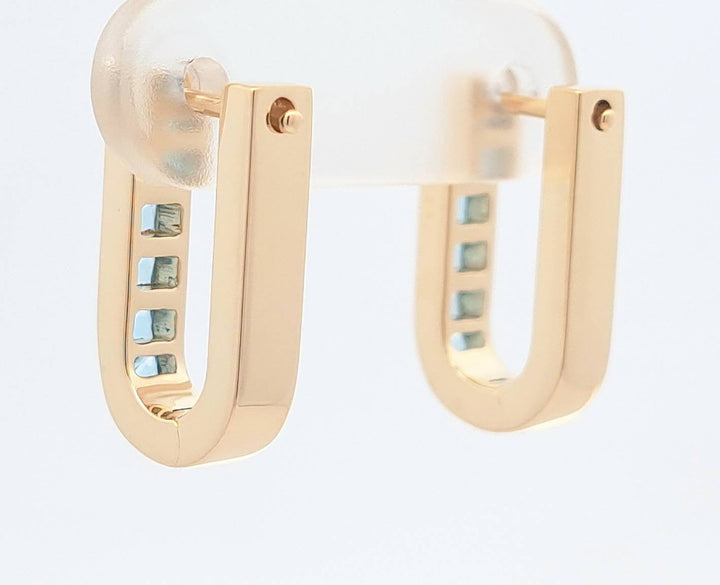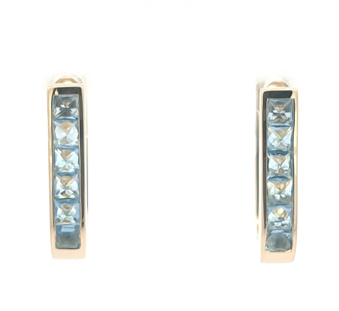Crafted from solid 14k yellow gold, these u-shaped earrings feature 12 Swiss Blue Topaz princess cuts (~0.78 ctw) with a reverse setting. They have a hinge closure.