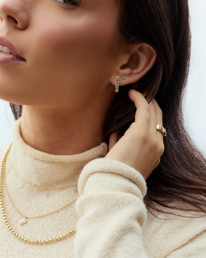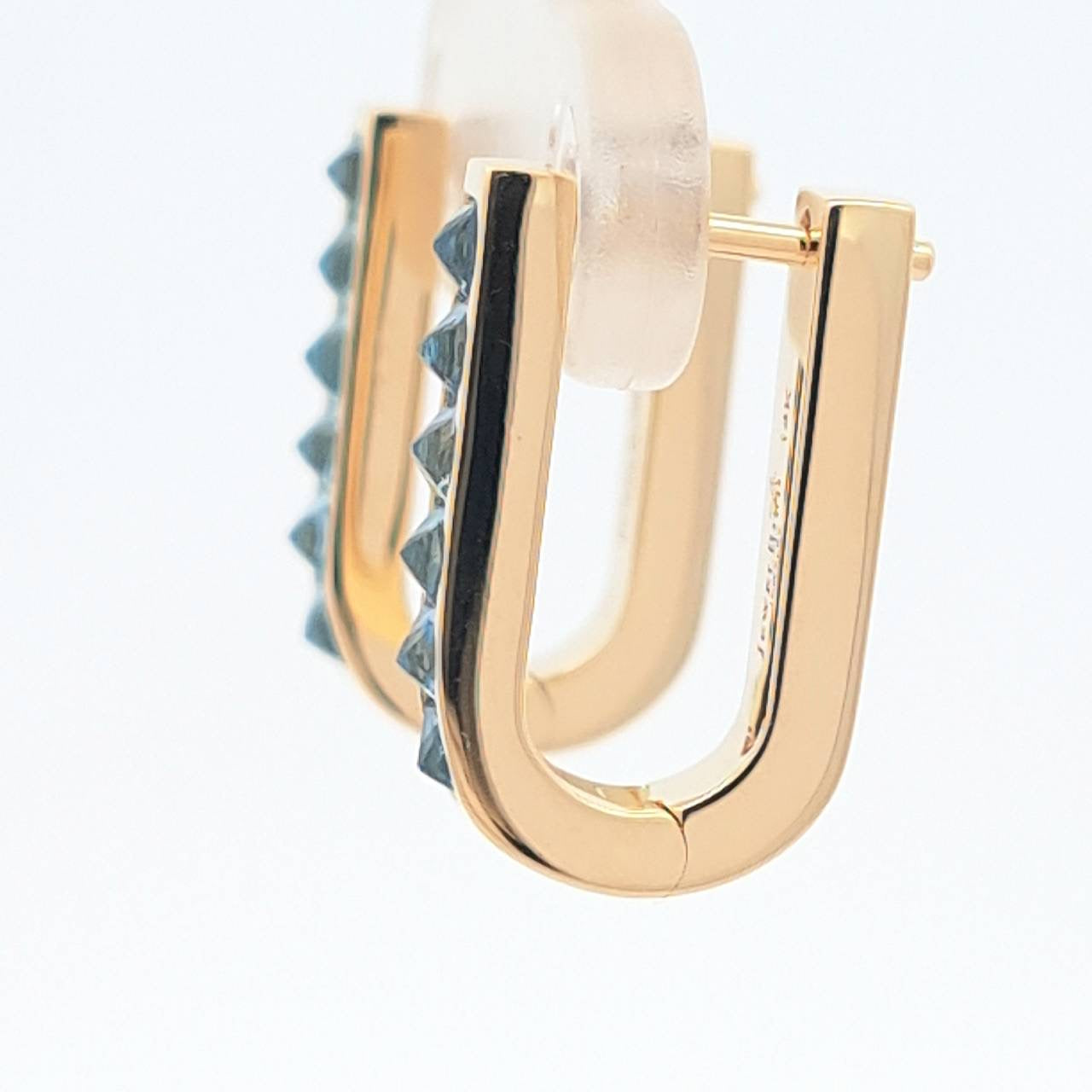 These Blue Topaz U-Shaped Earrings by Jewelbird are a chic and modern accessory with a touch of edge. The u-shaped design, crafted from solid yellow gold, is uniquely set with 12 Swiss Blue Topaz princess cuts, with their points facing outwards. This creates a bold and elegant look, perfect for those who want to add a stylish, architectural element to their jewelry.