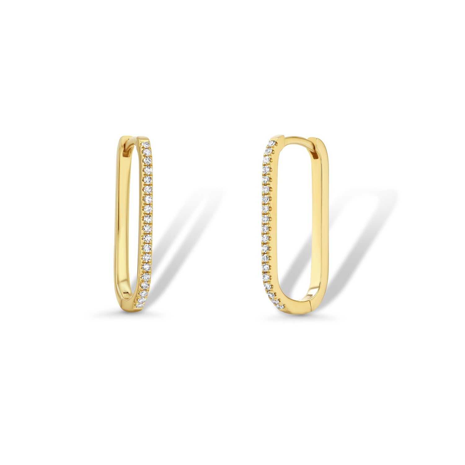 Crafted from 14k yellow gold, these huggie earrings are set with 74 round pave diamonds (~0.165 ctw). They measure 18mm x 10mm and have a hinge closure.