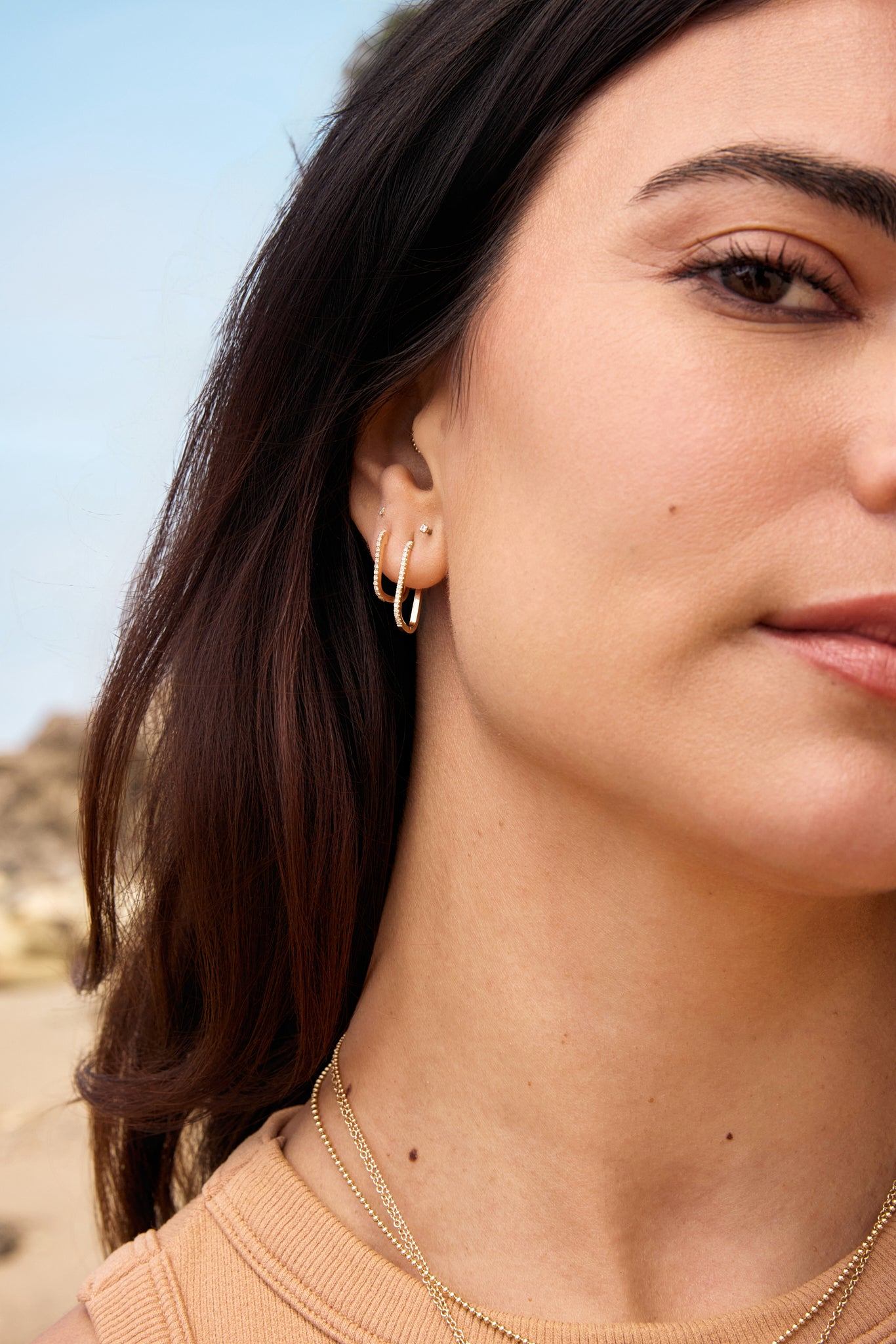 These Large U-Shaped Diamond Earrings by Jewelbird are a delicate and modern staple. The u-shaped huggie design, crafted from 14k yellow gold, features a single row of pave diamonds that create a continuous line of brilliant sparkle. With a secure hinge closure and a slightly larger size, these are perfect for making a statement on their own or for stacking with other earrings.