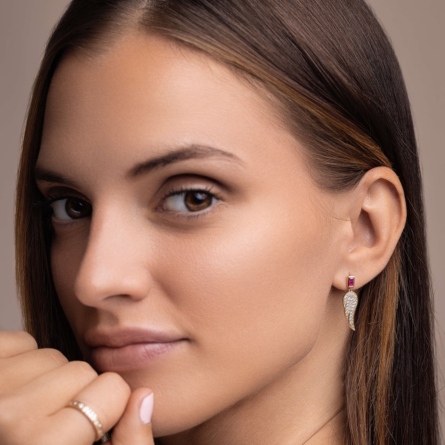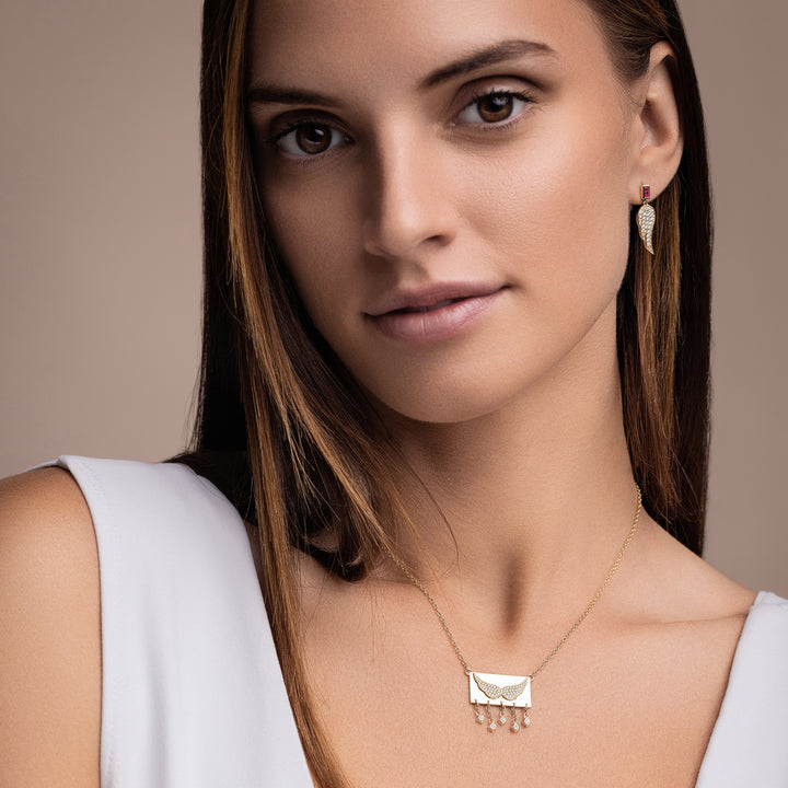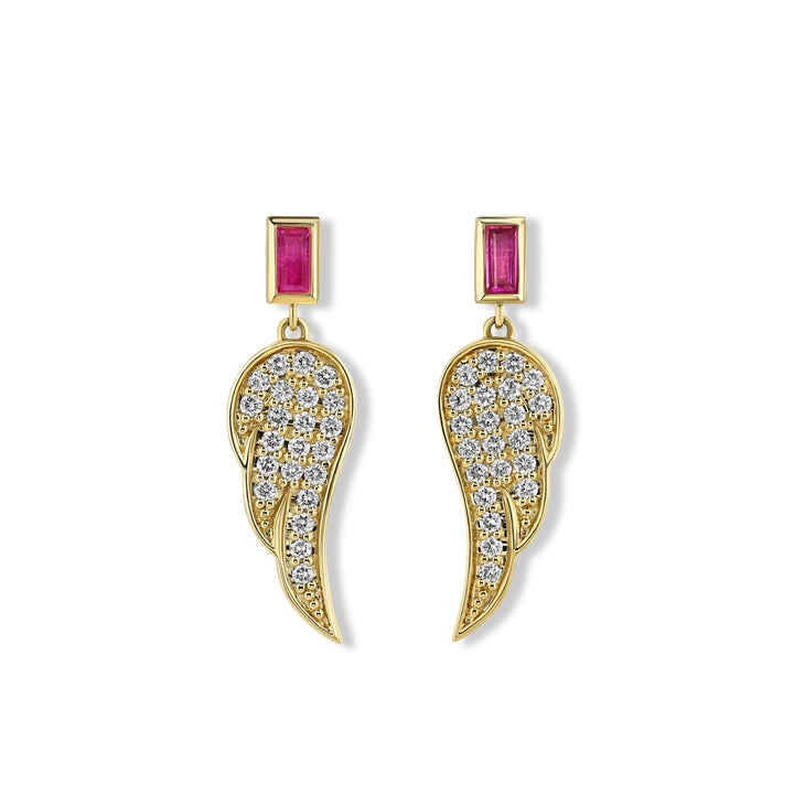 These Angel Wing Earrings by Jewelbird are a captivating blend of edgy and elegant. Crafted from solid yellow gold, the angel wing design is adorned with a mix of brilliant diamonds and deep-pink sapphire baguettes. This unique and luxurious piece adds a touch of sophisticated rebellion and celestial charm to your style.