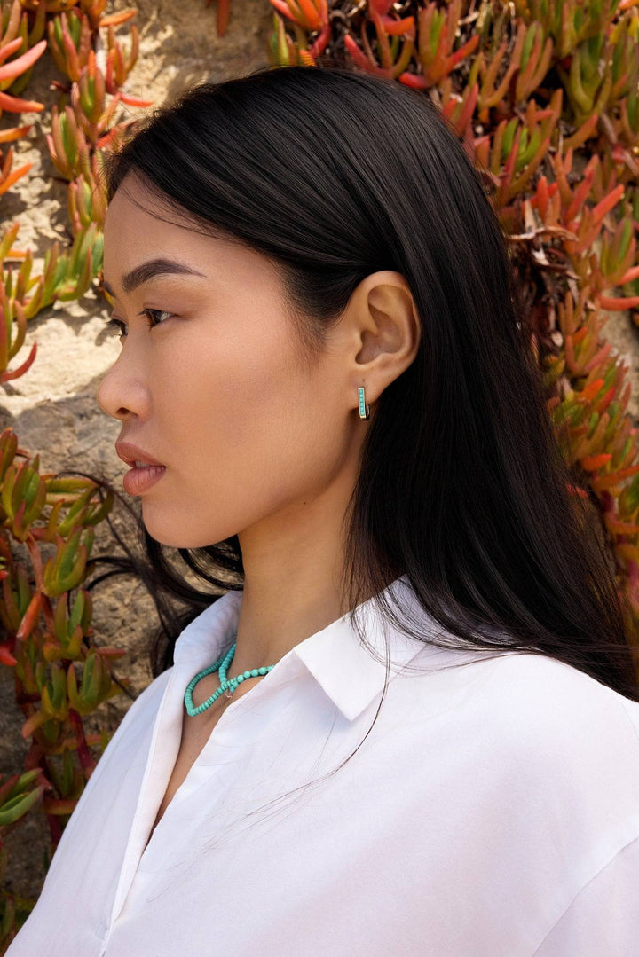 These Turquoise U-Shaped Earrings by Jewelbird are a bold and unique statement piece. The u-shaped design, crafted from 14k yellow gold, is set with 12 square turquoise stones in a unique reverse setting, where the points of the stones face outwards. This creates a modern and edgy look, perfect for adding a stylish pop of color to your elegance.
