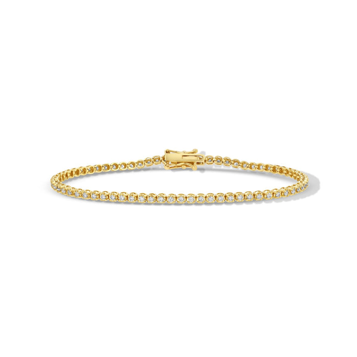 Made from 14k solid yellow gold. It features 1.08 ctw diamonds. The bracelet is 7.25 inches long.