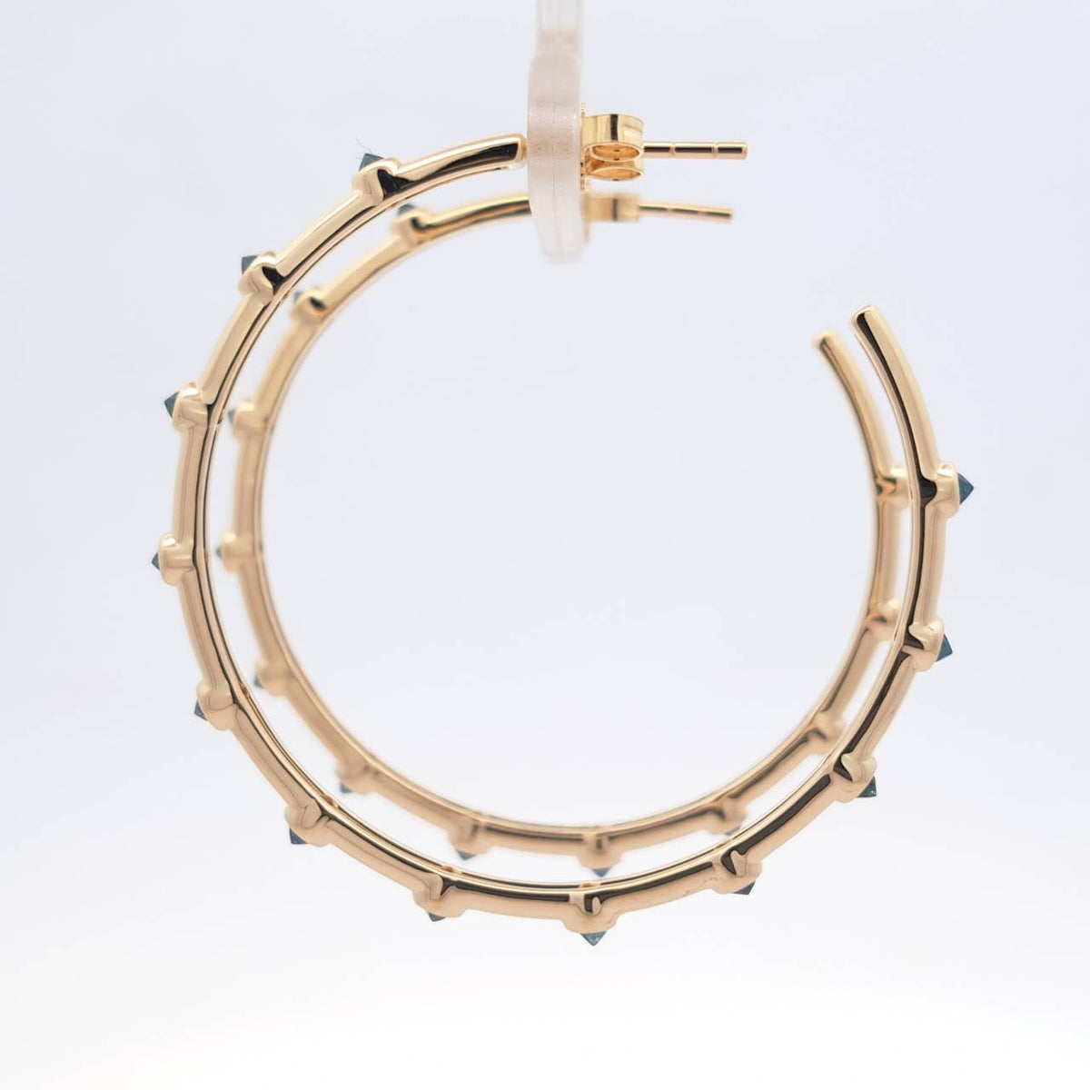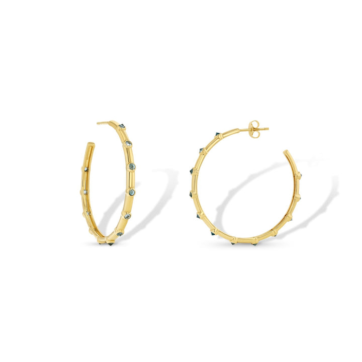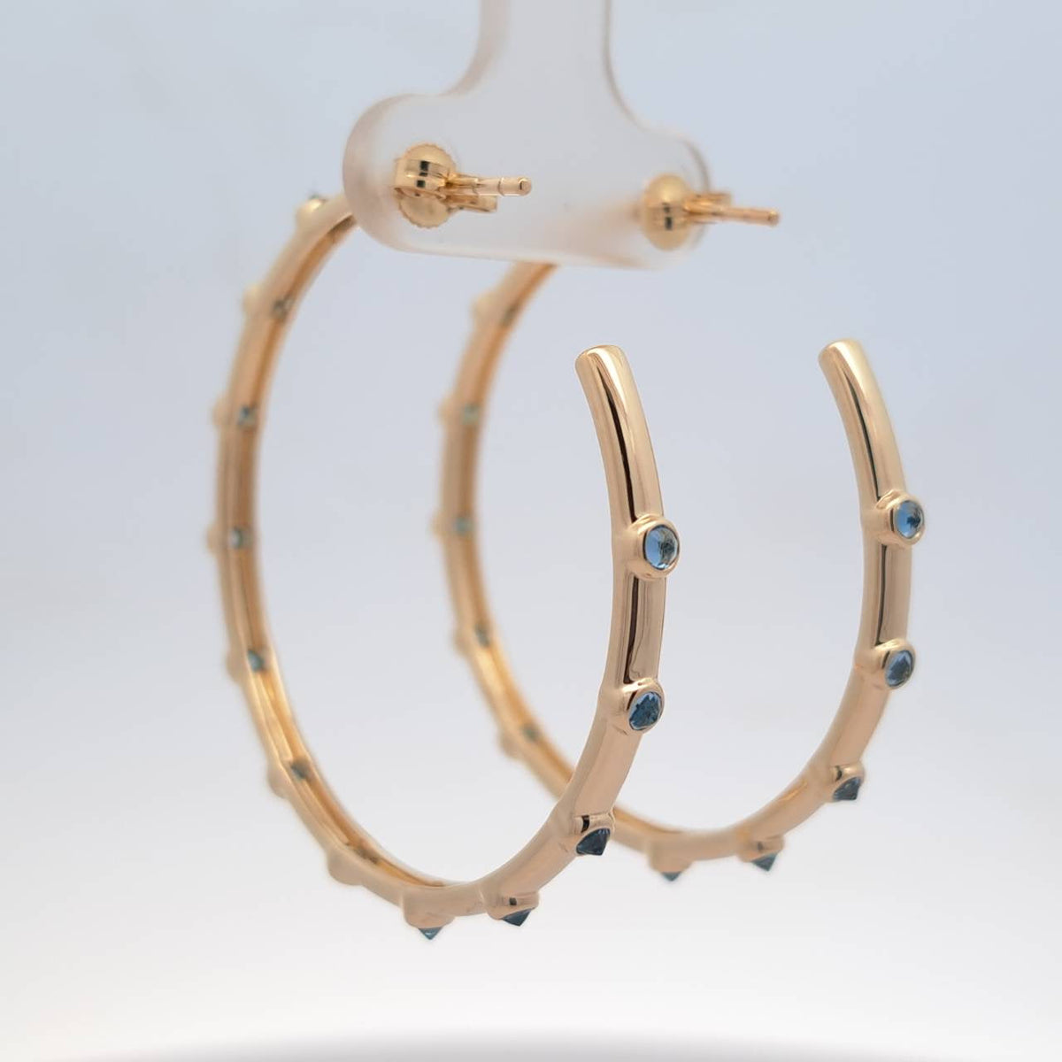 These Blue Topaz Hoop Earrings by Jewelbird are a stunning pair that adds an elegant edge to any look. The large 40mm hoops are beautifully accented with unique, reverse-set Swiss blue topaz points, creating a captivating and modern design. These earrings are perfect for those who want a statement piece that is both sophisticated and full of character. Their brilliant blue stones symbolize wisdom and clarity.