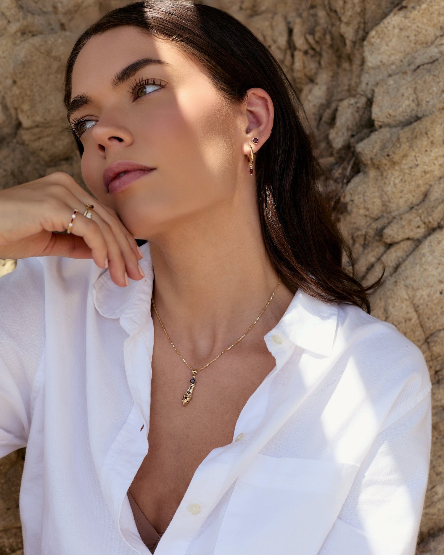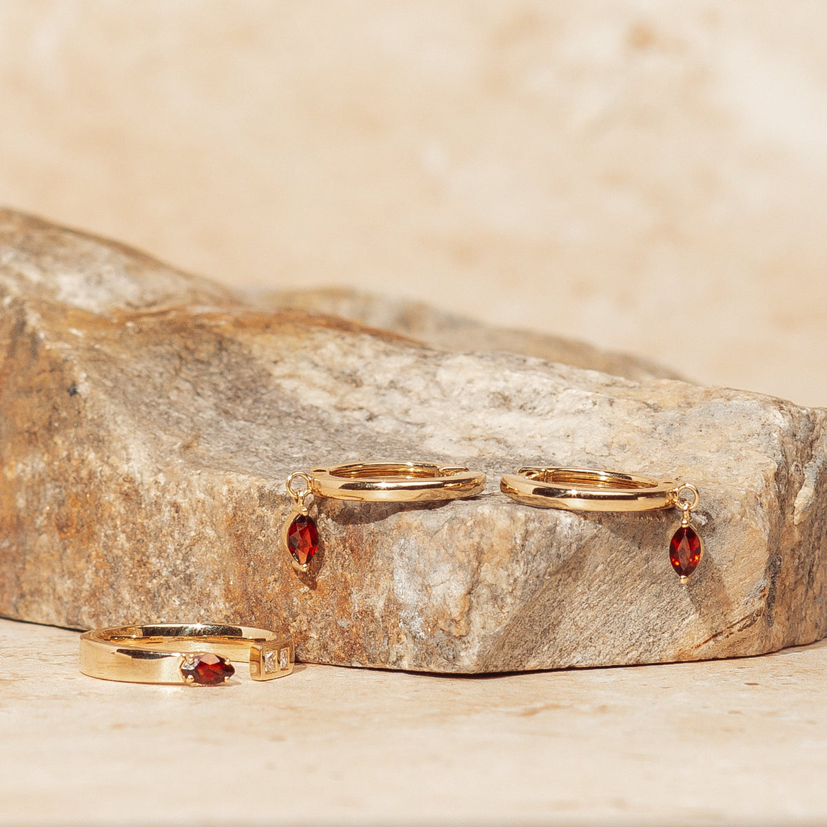 These Garnet Marquise Huggies by Jewelbird are a lovely and unique twist on the classic huggie hoop. Their larger size and the stunning contrast of the bright red garnet marquise stones against the polished gold make them a sophisticated and eye-catching accessory. These earrings are a beautiful statement of passion and confidence, perfect for stacking with other pieces or wearing alone to add a touch of vibrant color and elegance to your look.