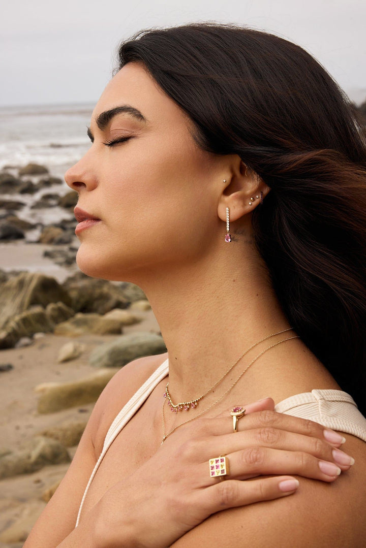These Diamomd & Pink Sapphire Pear Earrings by Jewelbird are a delicate yet substantial accessory, perfect for a wedding or any special occasion. They feature two prong-set, faceted pear-shaped pink sapphires and a series of round diamonds set on two gold bars. The combination of natural gemstones and 14k yellow gold creates a luxurious and elegant look.