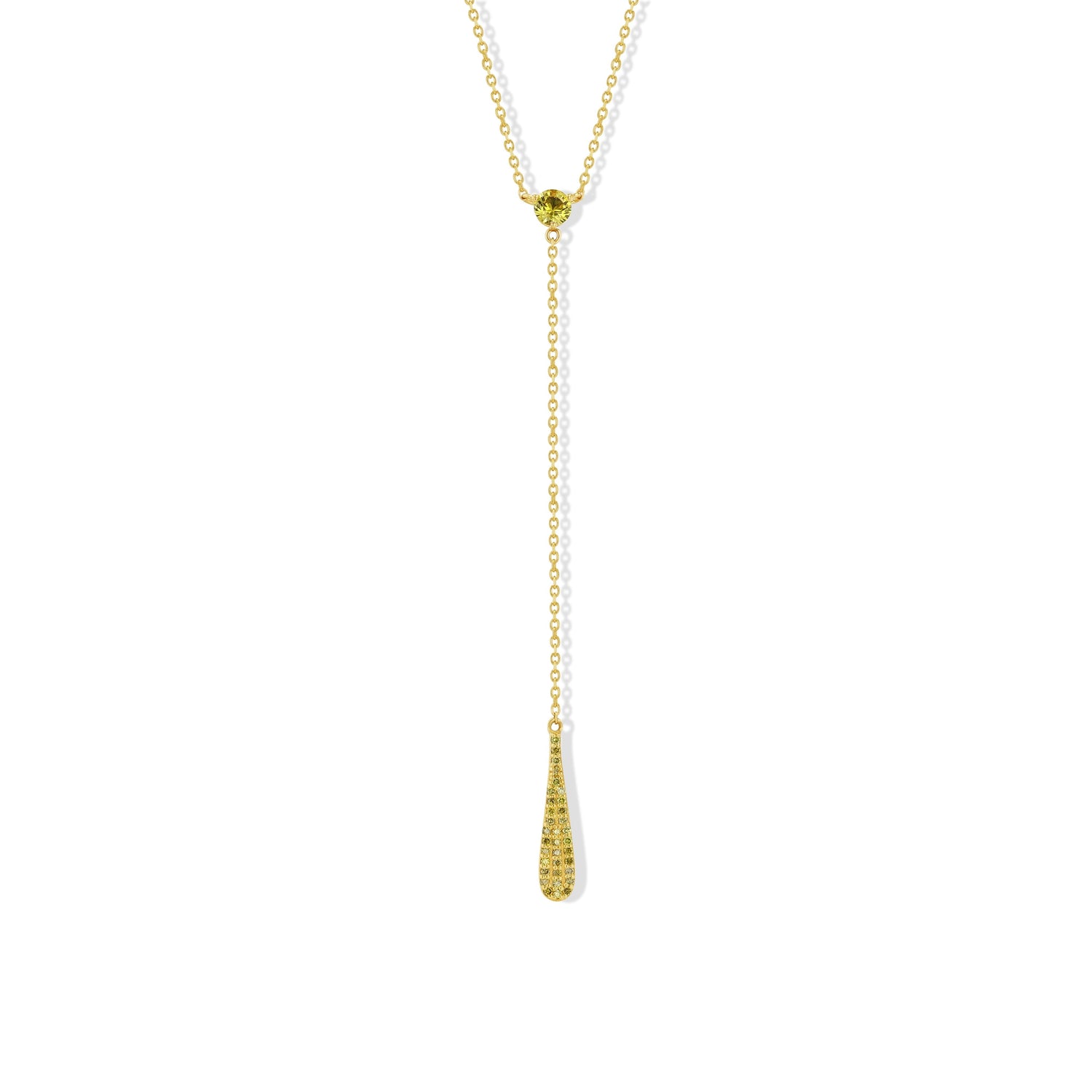 This necklace is made of 14k yellow gold and features a 0.46 ctw faceted natural yellow sapphire and 33 1mm natural, full-cut yellow diamonds totaling 0.17 ctw. It has an 18-inch fine cable chain with a 3-inch lariat drop.