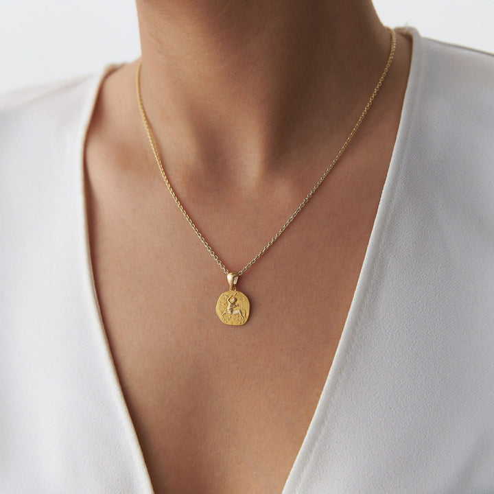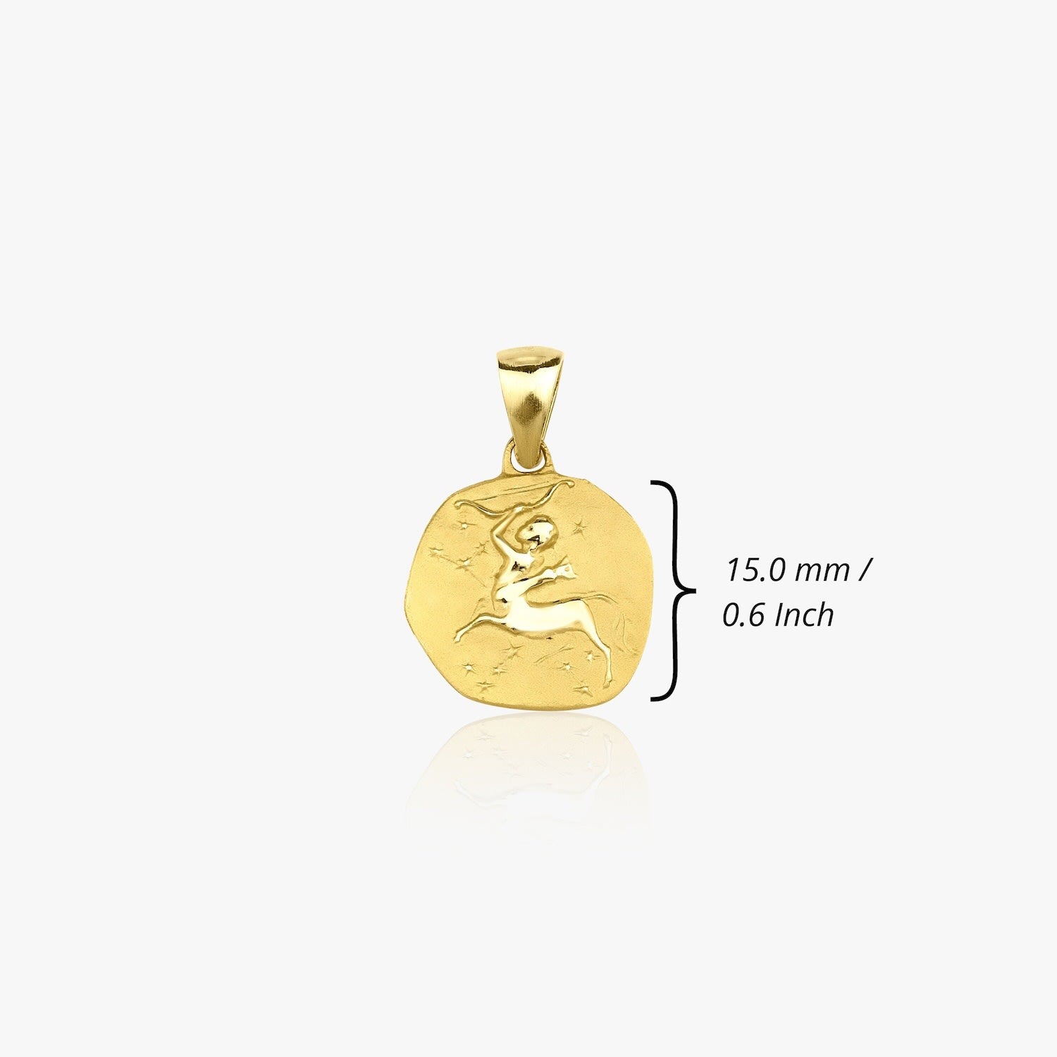 Materials: Crafted from 14k solid gold, this pendant is designed with an intricate Sagittarius coin motif.
