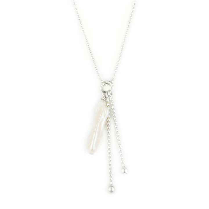 This necklace is made from sterling silver and features a natural stick pearl. It has a ball chain.