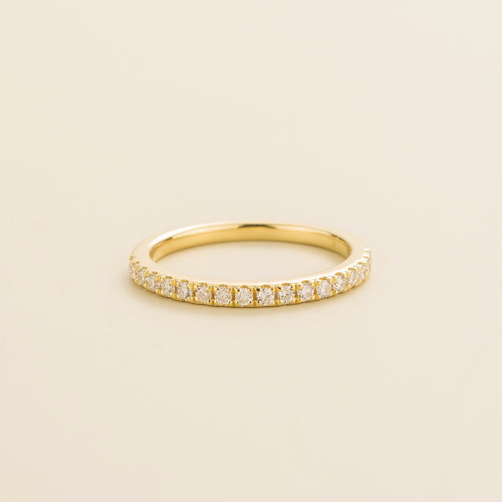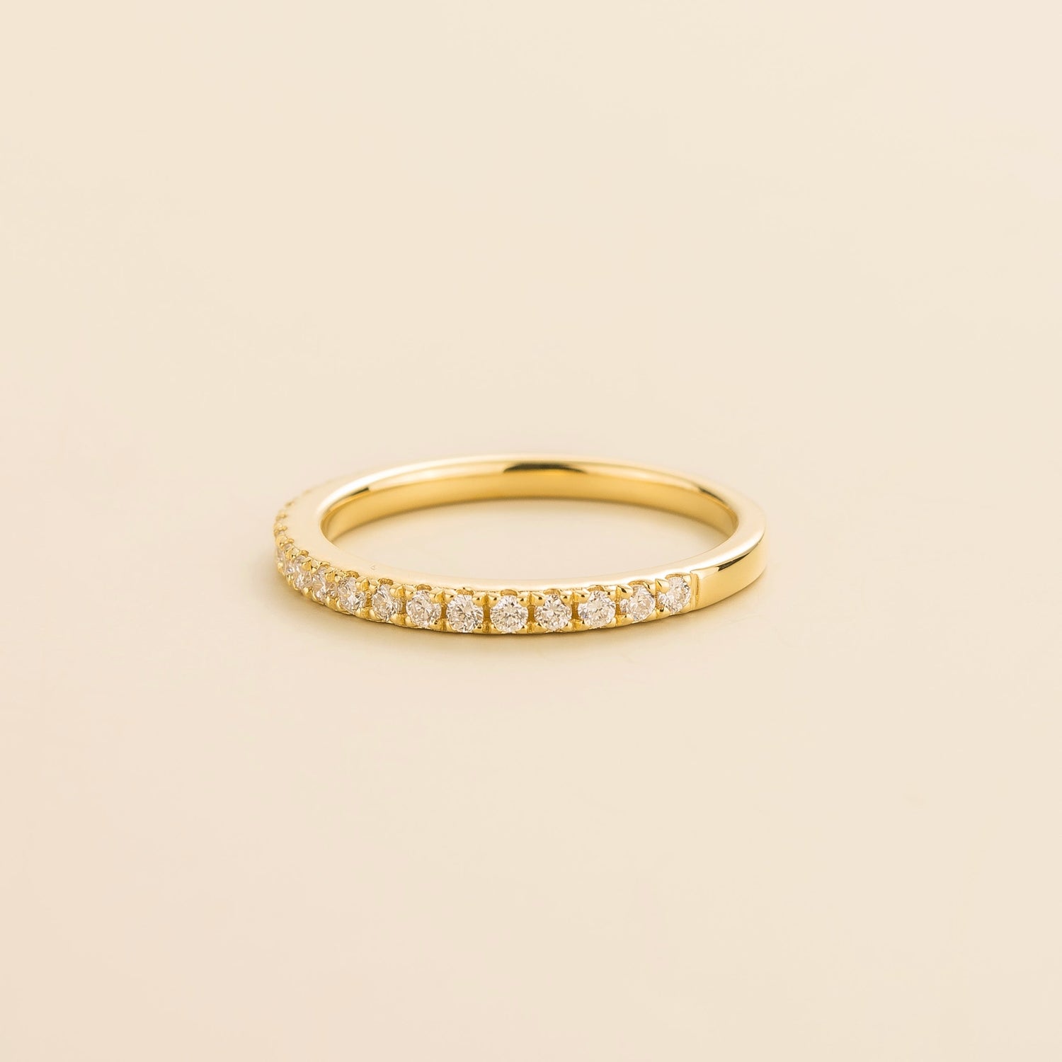 This ring is crafted from 18K gold vermeil and set with 18 round diamonds, totaling approximately 0.27 carats. The band measures 1.9mm in width and 1.5mm in thickness.