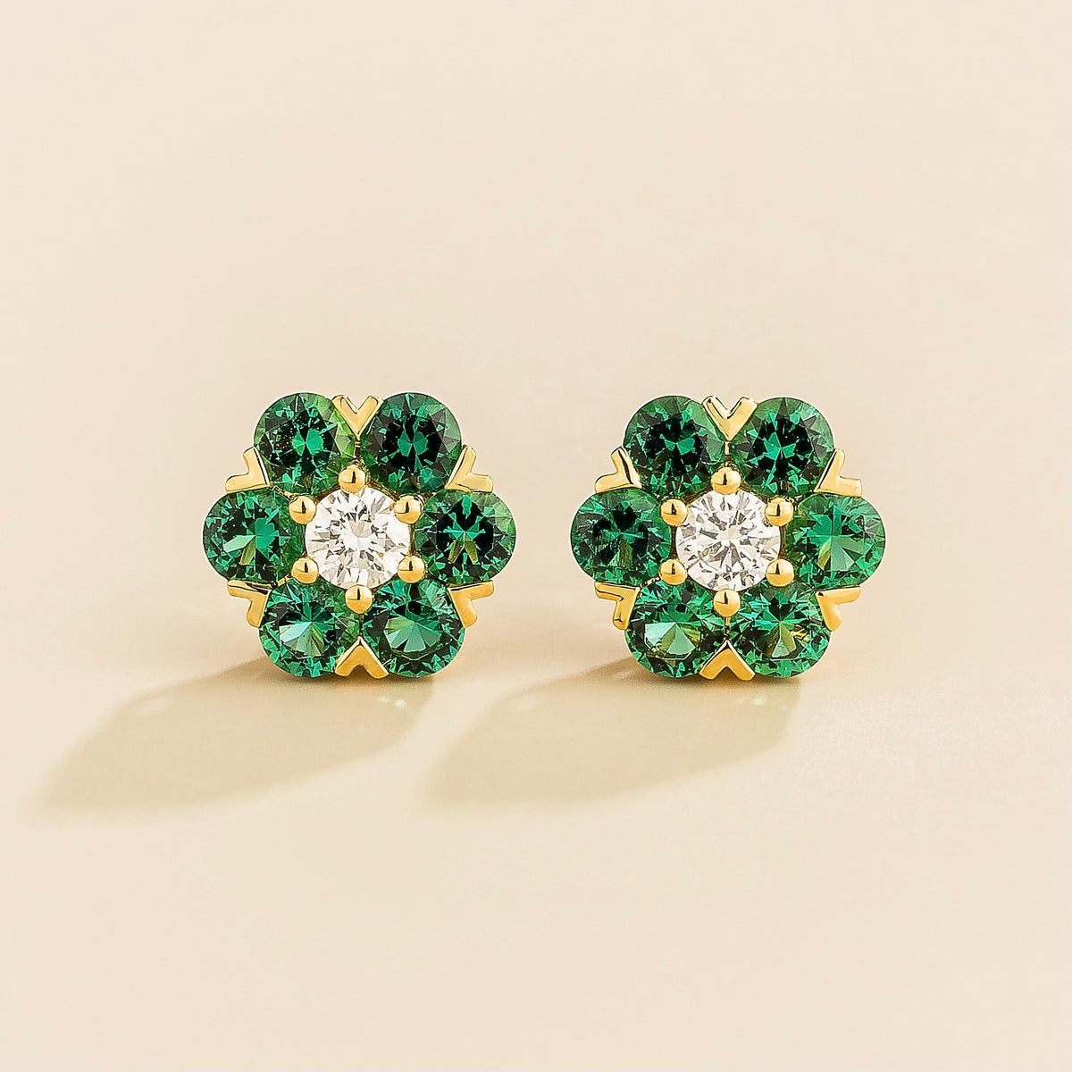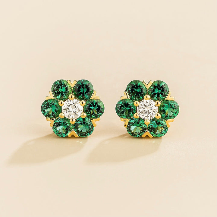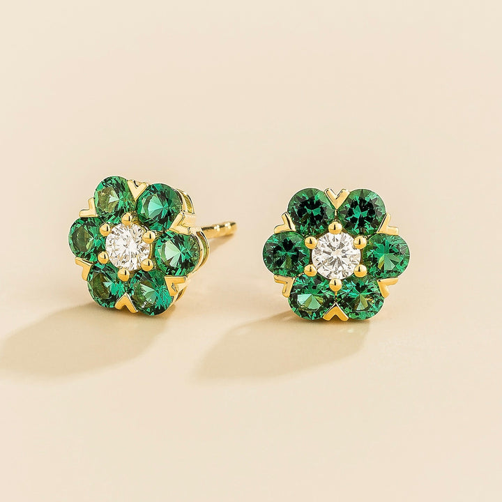 These earrings are crafted from 18K gold vermeil and are set with diamonds (D-F Vs grade, approximately 0.2 carats) and emeralds (approximately 1.2 carats). The dimensions of each earring are 9.2mm high and 4.5mm deep.