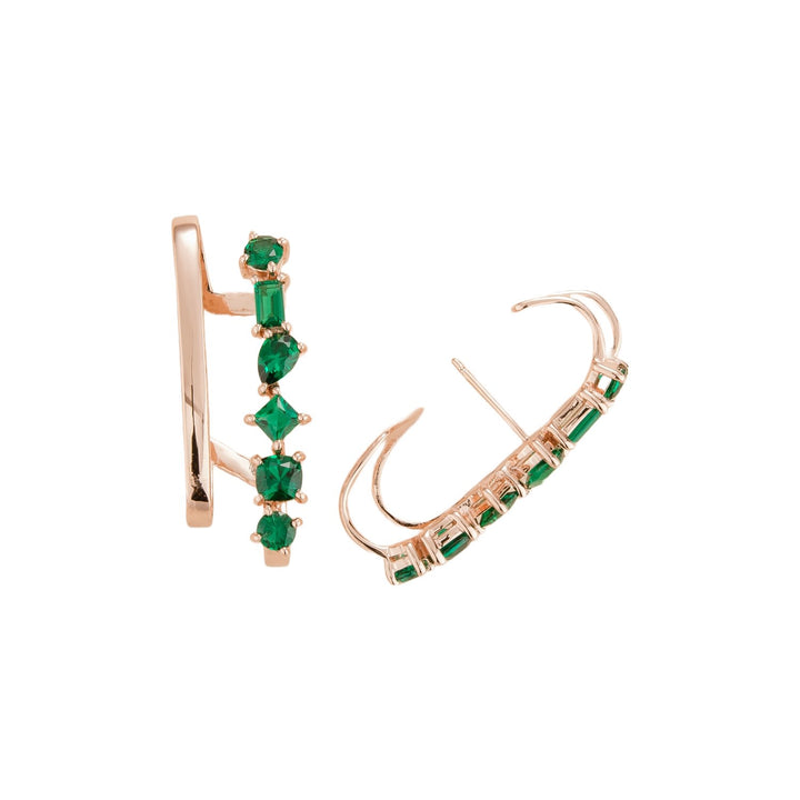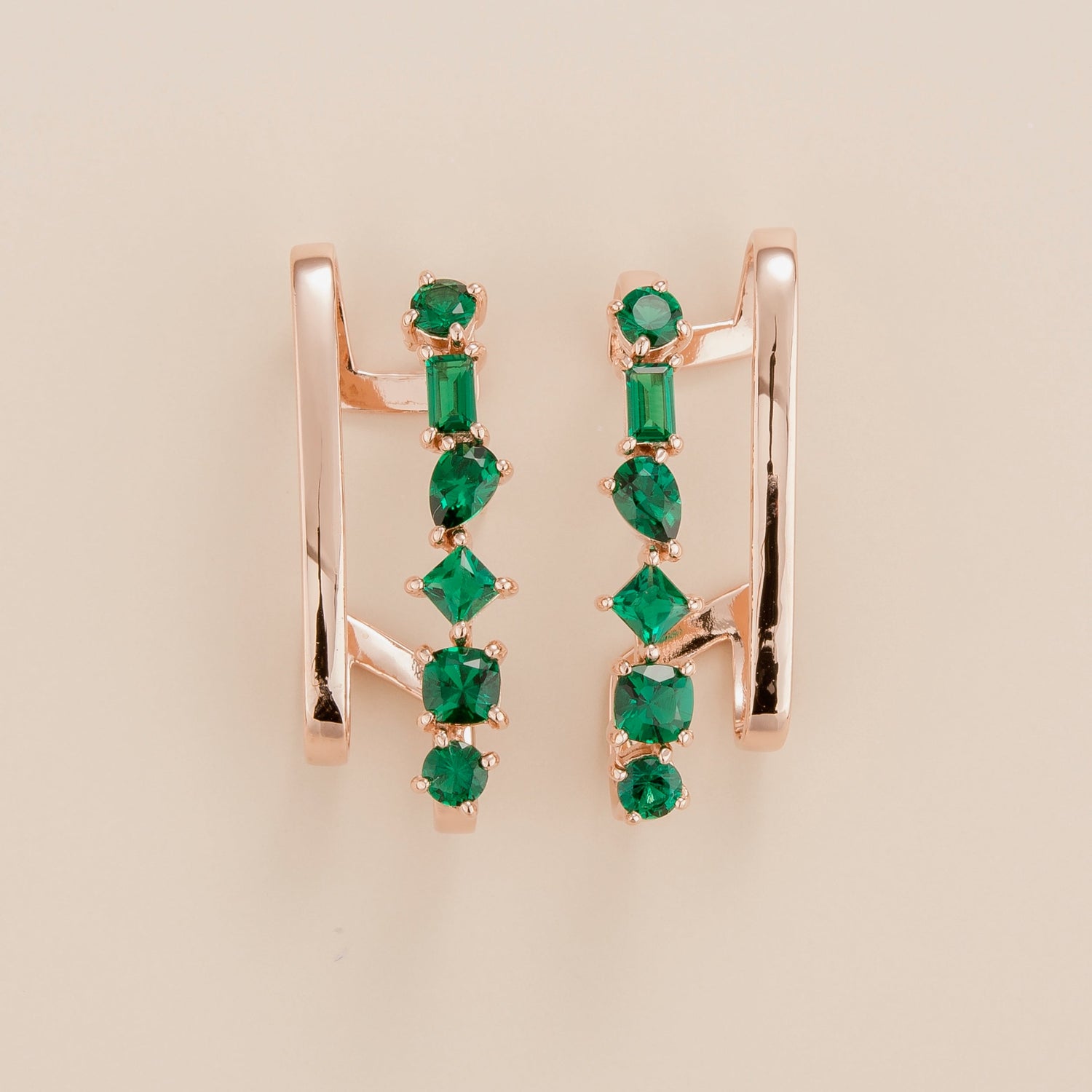 These Serene Rose Gold Earrings With Emerald by Juvetti are a captivating and stylish accessory. These cuff earrings are adorned with beautiful emerald gemstones set in 18K rose gold vermeil. The elegant design is perfect for adding a pop of color and luxury to any ensemble.