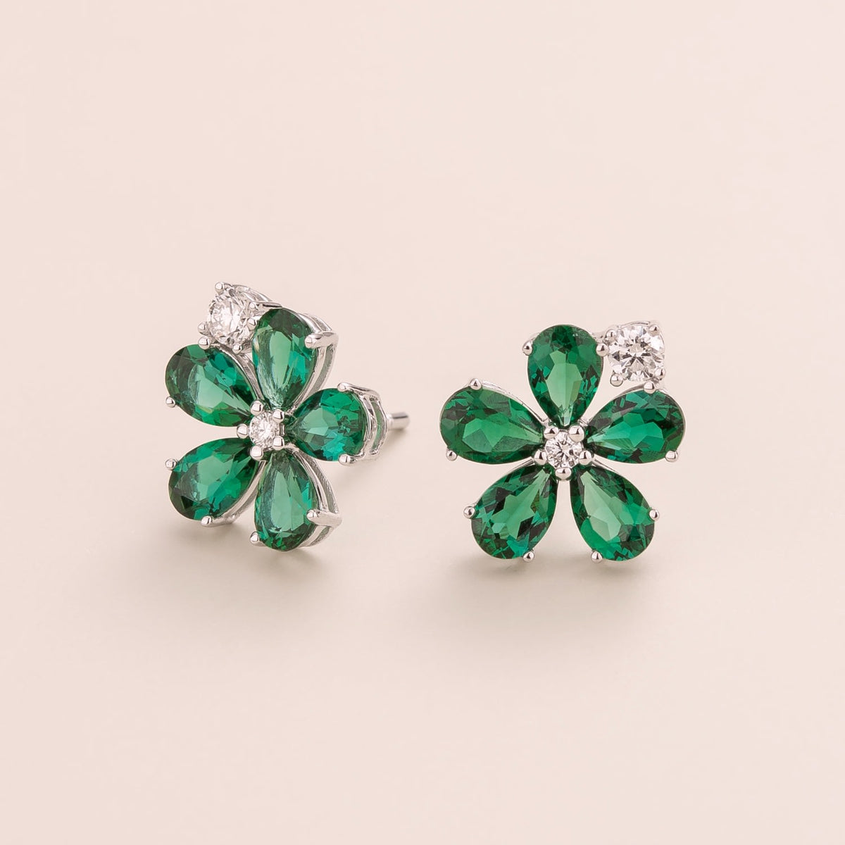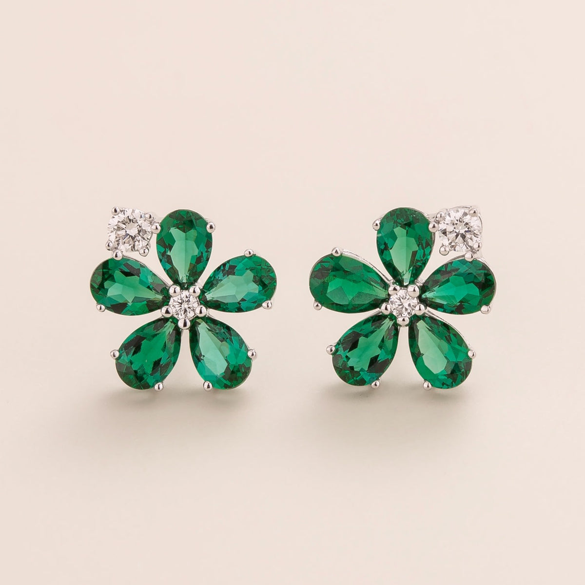 Crafted from 18K white gold vermeil, these earrings are set with natural diamonds (~0.3 carats) and emeralds (~4.2 carats). Each earring measures 15.2mm in height, 13.4mm in width, and 3mm in depth.