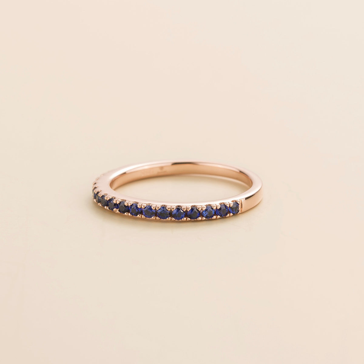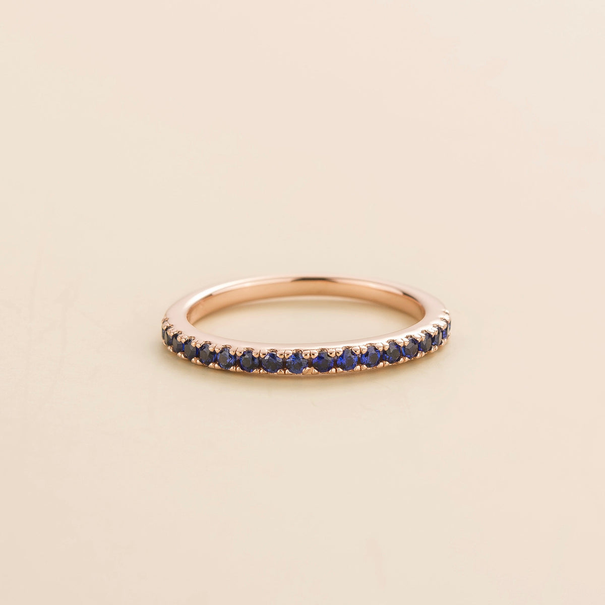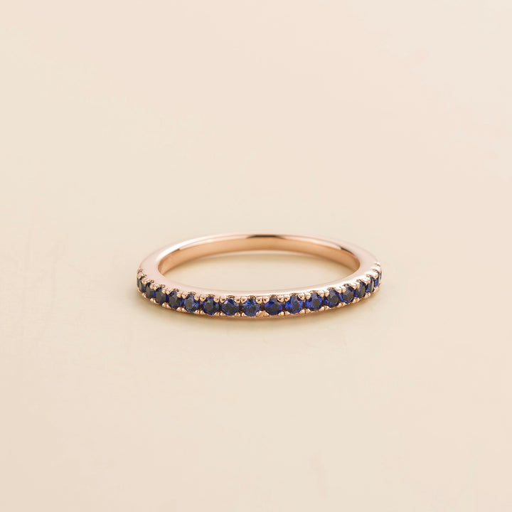 The Salto Ring in Blue Sapphire Set in Rose Gold by Juvetti is a beautiful and luxurious ring. It is set with 0.54 carats of blue sapphire gemstones in an 18K pink gold vermeil setting. Its elegant design and vibrant stones make it a precious piece that will maintain its brilliance over time.