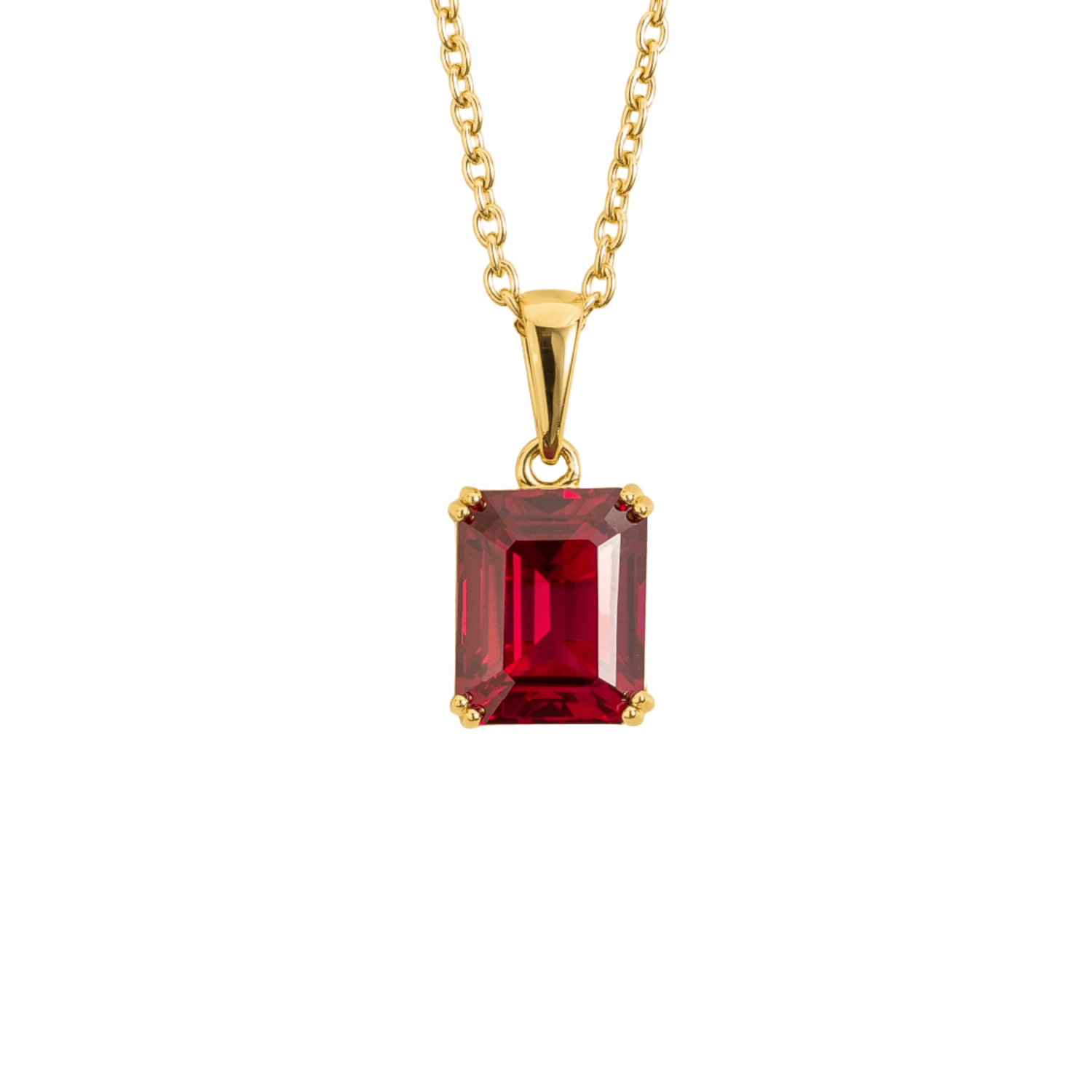The Thamani Gold Pendant Necklace In Ruby is a fine jewelry piece that exudes elegance. This pendant necklace features a stunning, 4-carat emerald-cut ruby. It is set in 18K gold vermeil on an adjustable chain, creating a luxurious and timeless accessory.