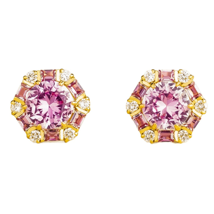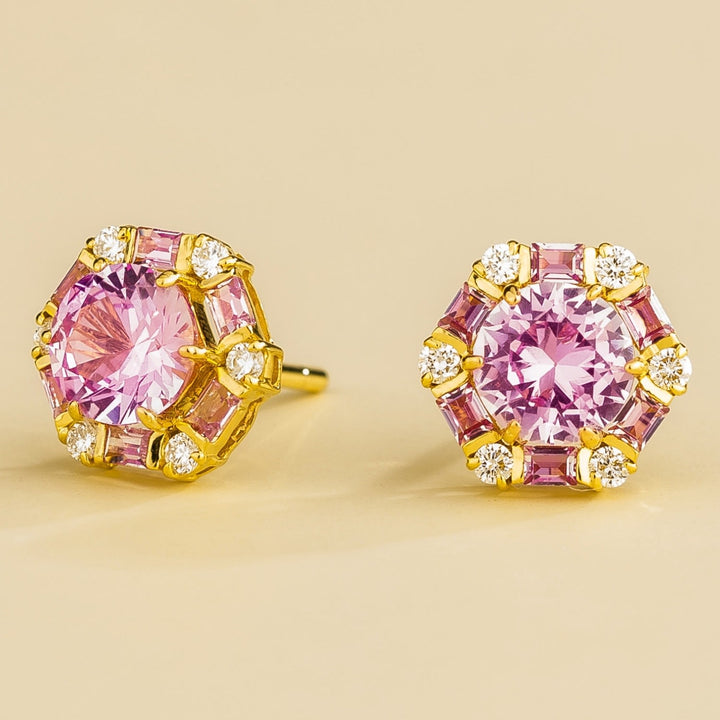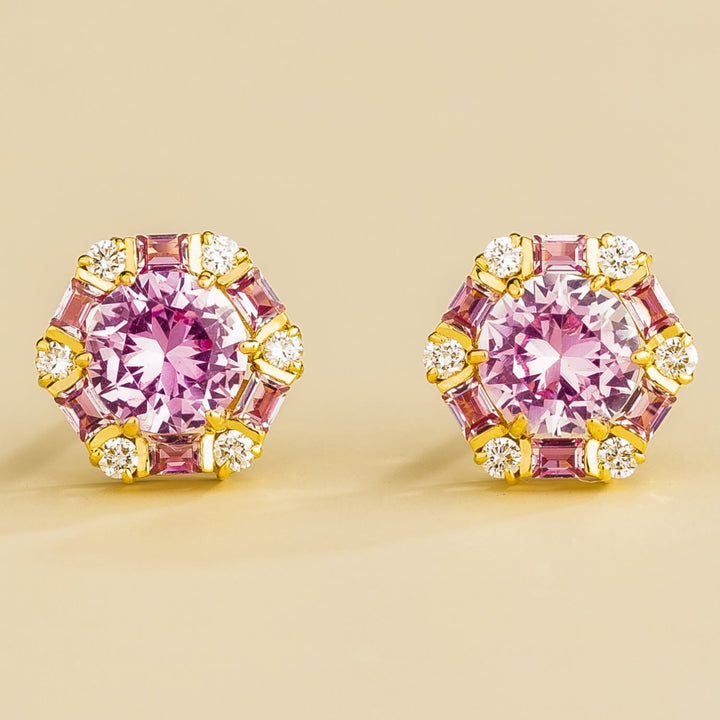 Crafted from 18K gold vermeil, these earrings are set with VS grade natural diamonds (~0.20 carats) and pink sapphires (~2.4 carats). Each earring measures 10mm in height, 9.5mm in width, and 4.6mm in depth.