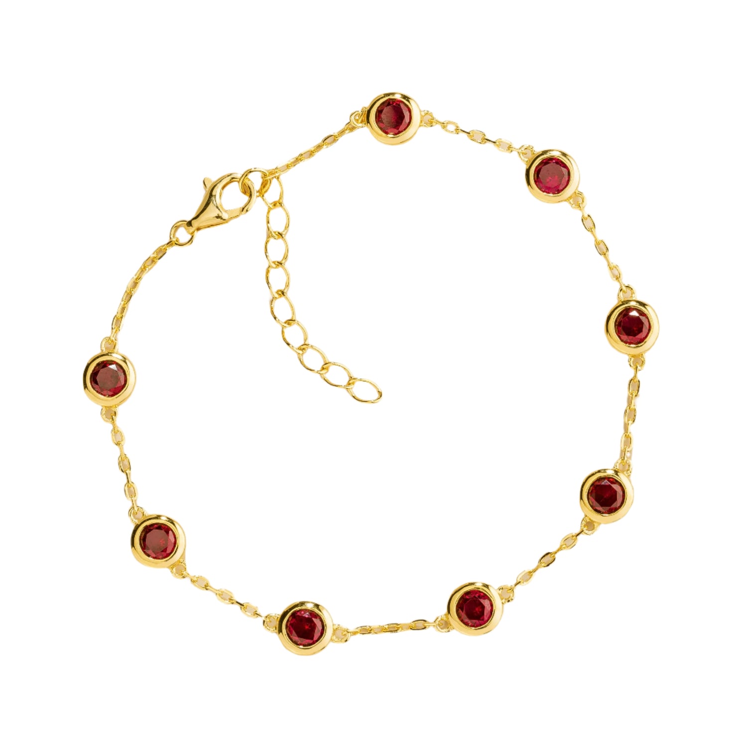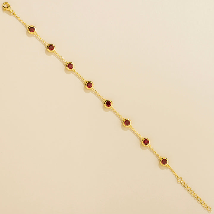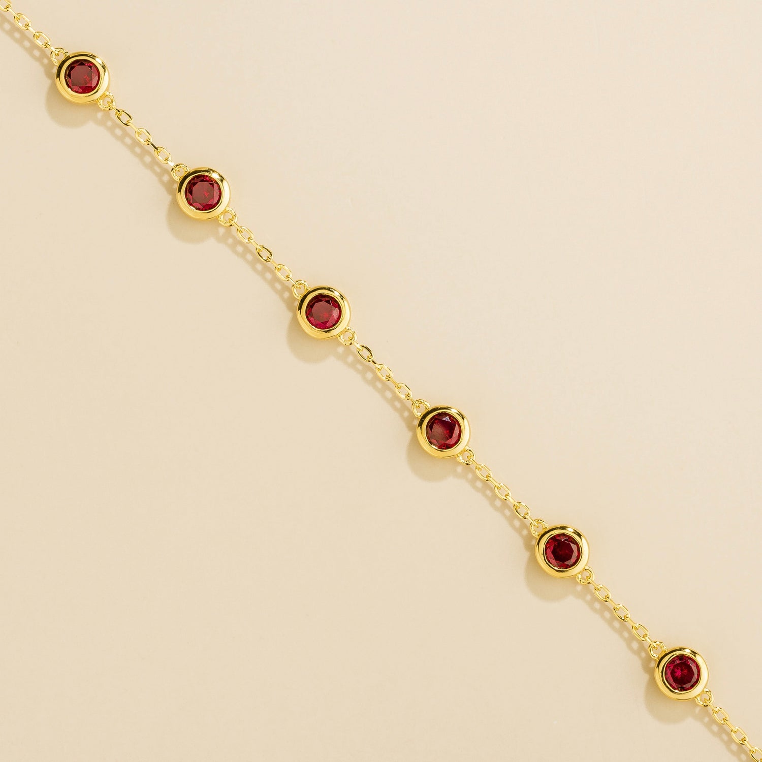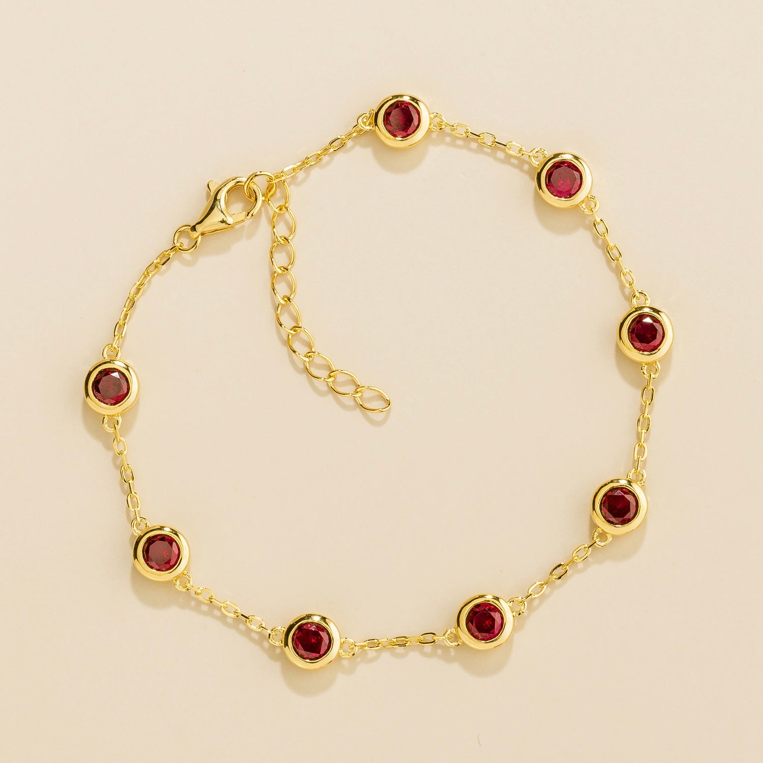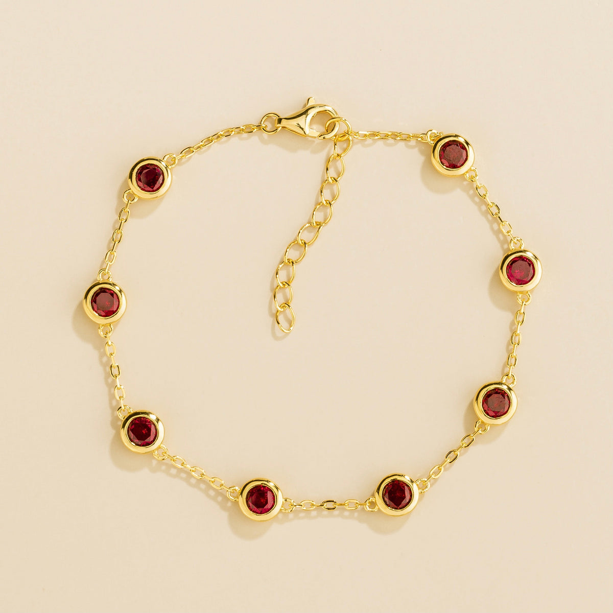 This bracelet is crafted from 18-karat gold vermeil and features eight princess-cut rubies with an approximate total weight of 1.36 carats. The chain is adjustable from 6.5-7.5 inches. Options are available in 9K, 14K, and 18K gold.
