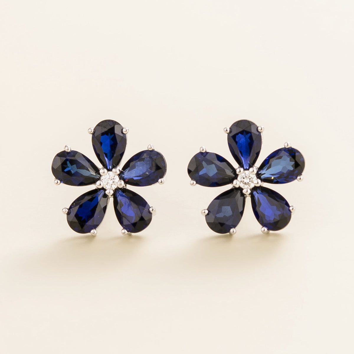 Crafted from 18K white gold vermeil, these earrings feature blue sapphires (~5.0 carats) and natural diamonds (~0.1 carats). Each earring measures 13.1mm in height, 13.4mm in width, and 3mm in depth.
