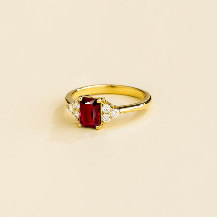 This ring is crafted from 18K gold vermeil and features a 1.2-carat emerald-cut ruby (7mm x 5mm) and approximately 0.2 carats of D-F VS+ grade diamonds. The crown dimensions are 7.4mm high by 13.5mm wide by 5.3mm deep, with a band measuring 2.3mm wide and 1.5mm thick.