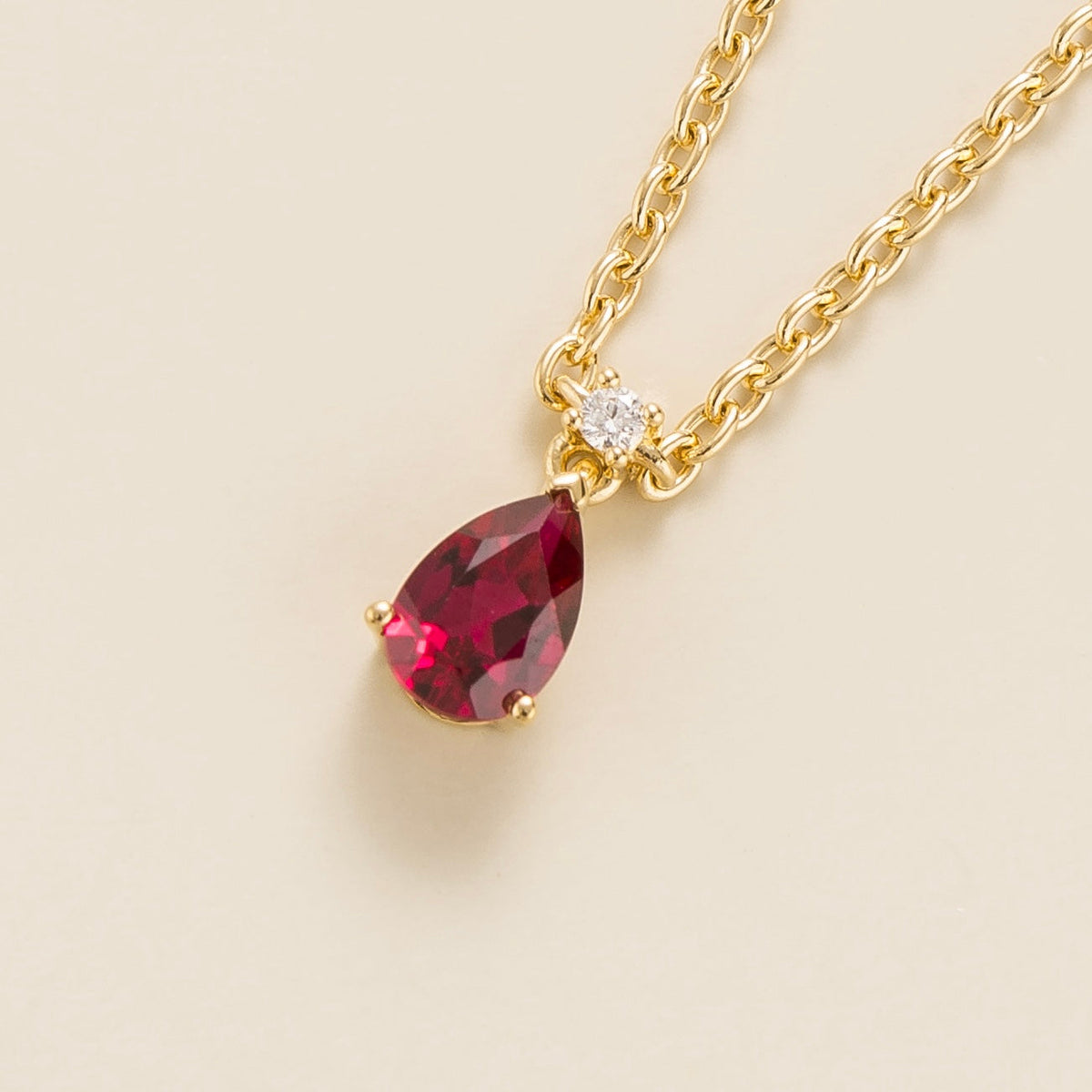 This necklace is crafted from 18K gold vermeil and features a 0.51-carat ruby (6mm x 4mm) and a 0.03-carat diamond (1.5mm, VS grade). The pendant measures 9.5mm high by 4.5mm wide by 3.9mm deep, and the chain is 16-18 inches long.