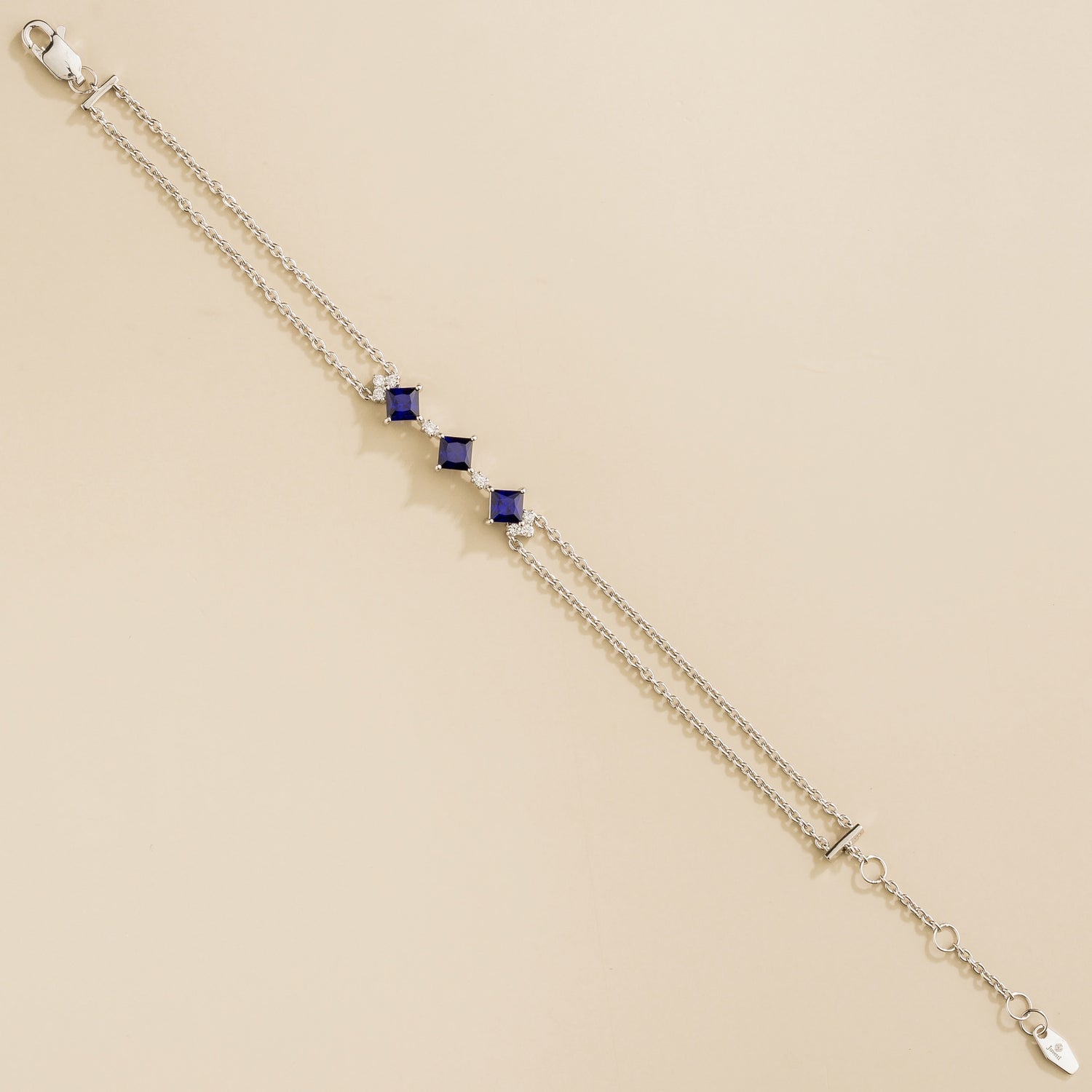 This piece is crafted from 18-karat white gold vermeil, featuring princess-cut blue sapphires with an approximate total weight of 1.36 carats and round diamonds with an approximate total weight of 0.32 carats (D-F VS grade). The chain is adjustable from 6.5-7.5 inches. Options are available in 9K, 14K, and 18K gold.