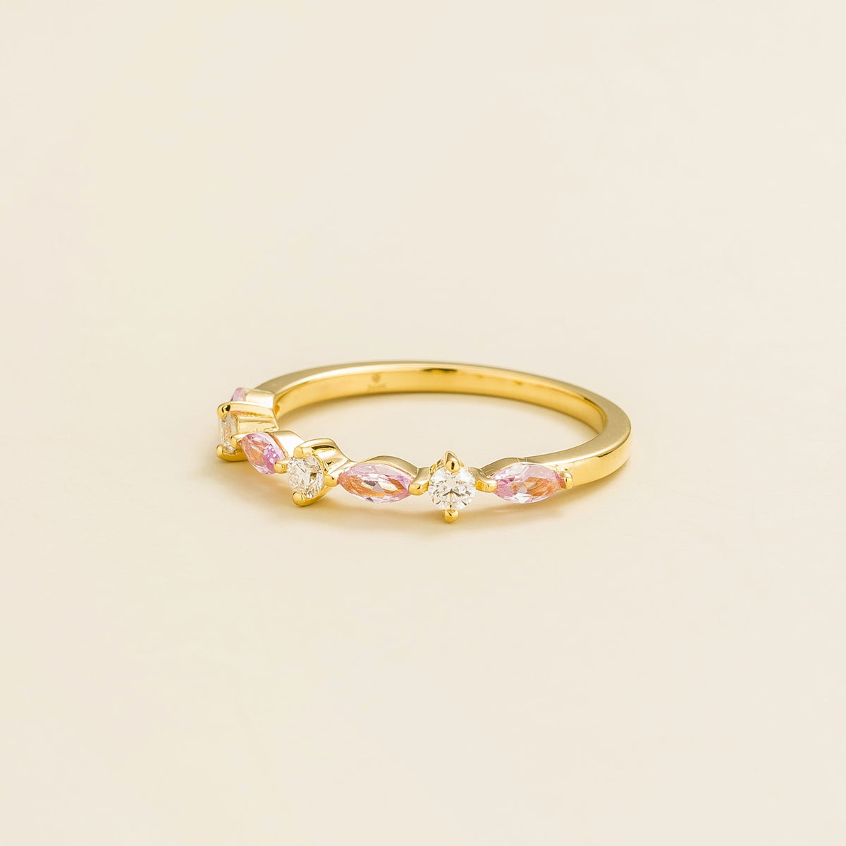 This Markiz Gold Ring by Juvetti is an elegant and modern piece. The 18K gold vermeil band features a graceful arrangement of marquis-cut pink sapphires and round diamonds. The minimalist design and thin band make it a beautiful and sophisticated accessory that can be worn alone or stacked for a layered look.