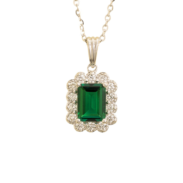 This necklace is crafted from 18k white gold vermeil and is set with a beautiful emerald (approximately 1.3 carats) and diamonds (approximately 0.5 carats, VS+ grade). The chain is adjustable from 16-18 inches.