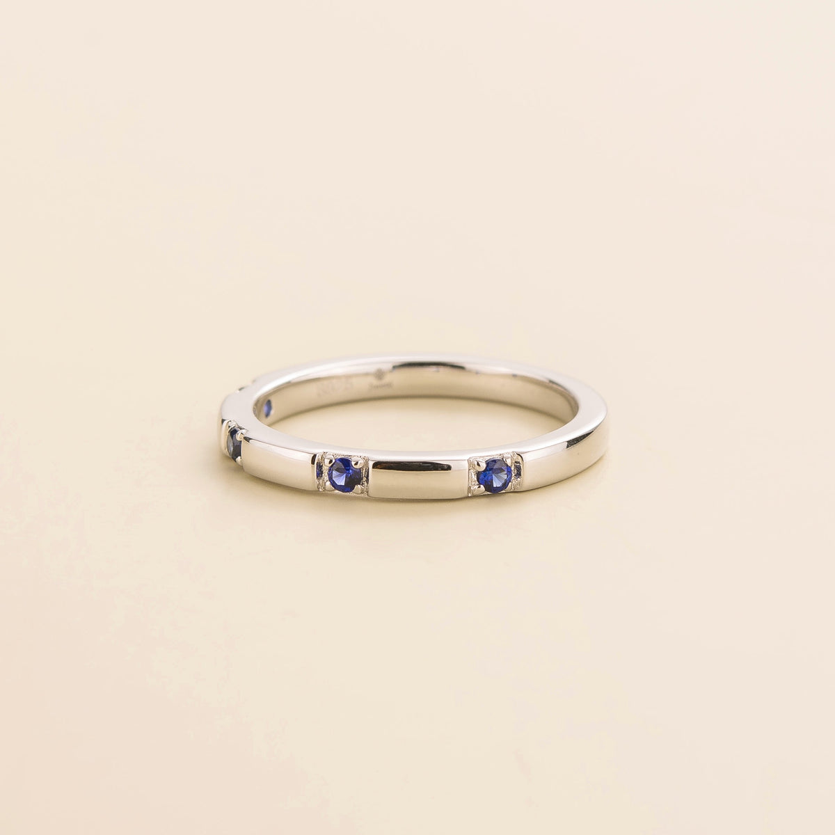 This ring is crafted from gold and is set with four round-cut blue sapphires (approximately 0.16 carats). The band is 2.1mm wide and 1.7mm thick.