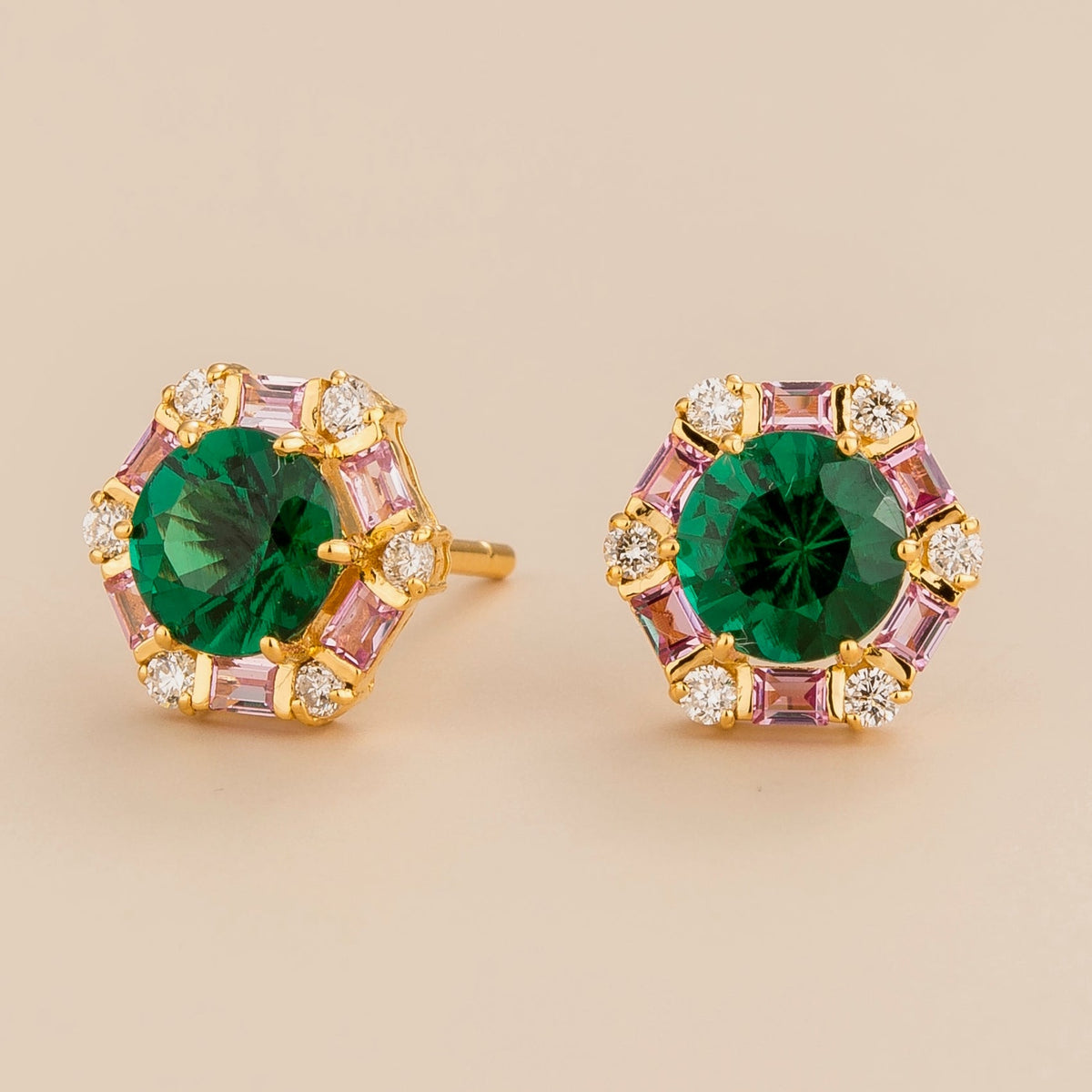 Crafted from 18K gold vermeil, these earrings feature lab-grown emerald (~1.44 carats), lab-grown pink sapphire (~0.30 carats), and natural diamonds (~0.20 carats). Each earring measures 10mm in height, 9.5mm in width, and 4.6mm in depth.