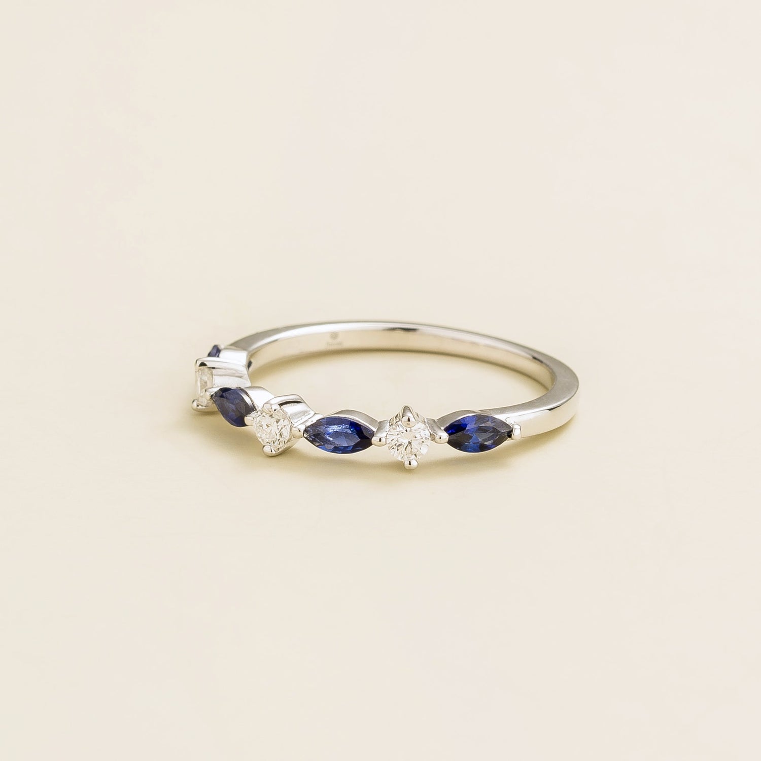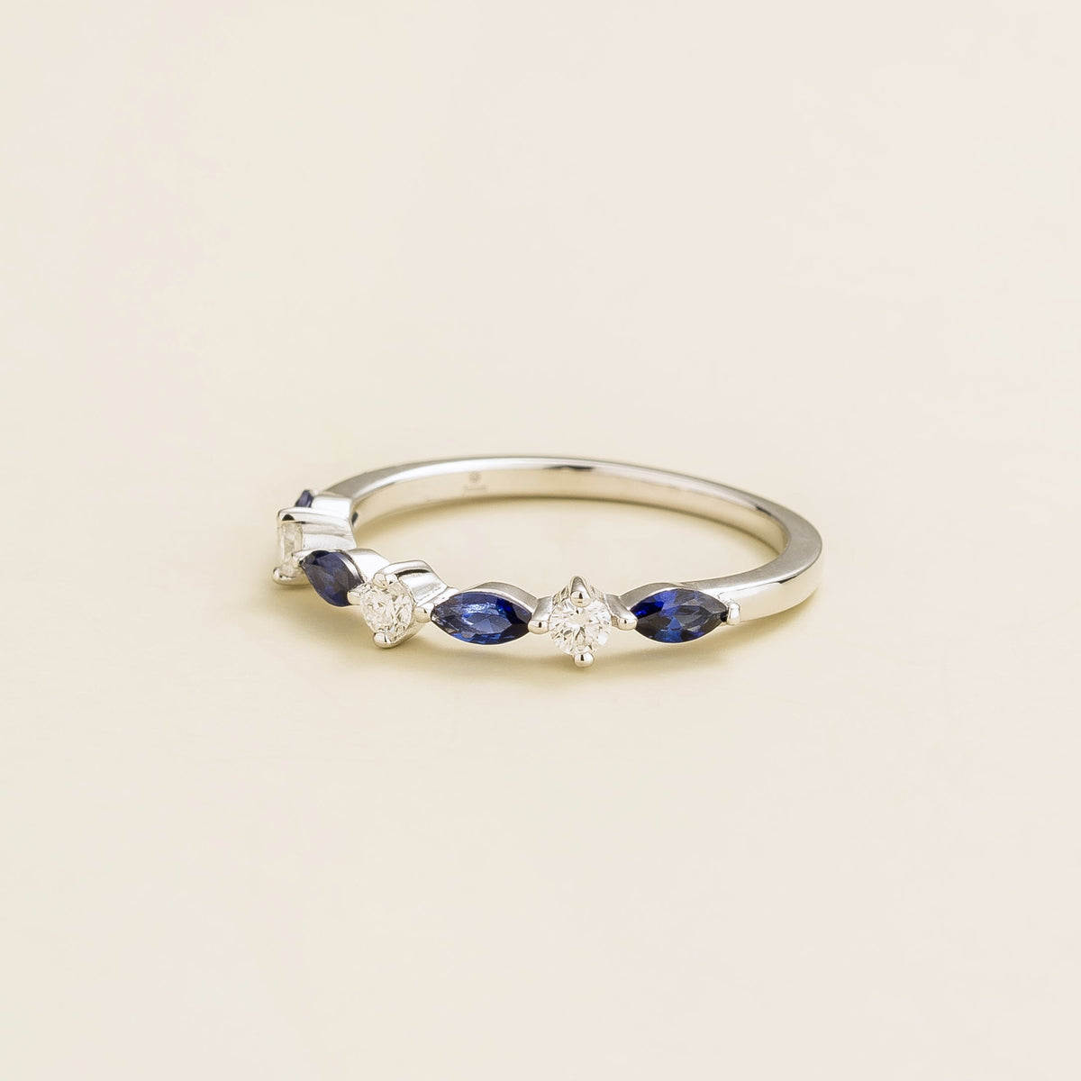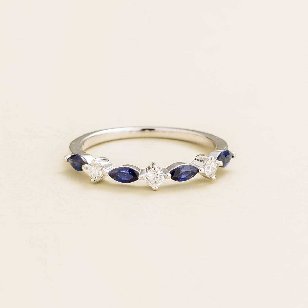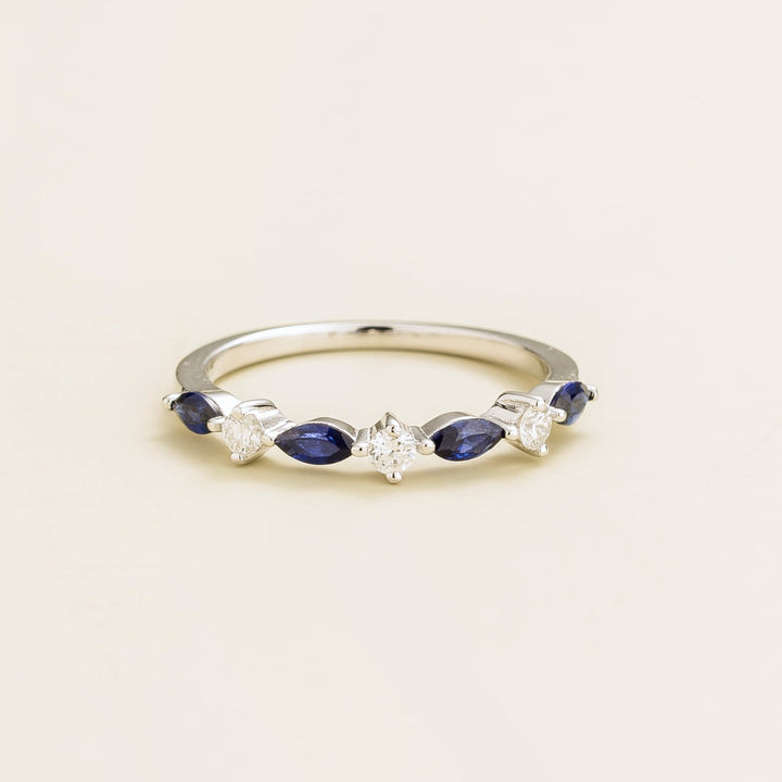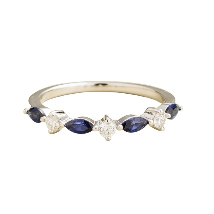 Handmade in white gold (options in 9k, 14k, or 18k). Set with marquis-cut blue sapphires (3.2mm x 3mm) and round diamonds. Band measures 1.5mm width x 1.5mm thickness.