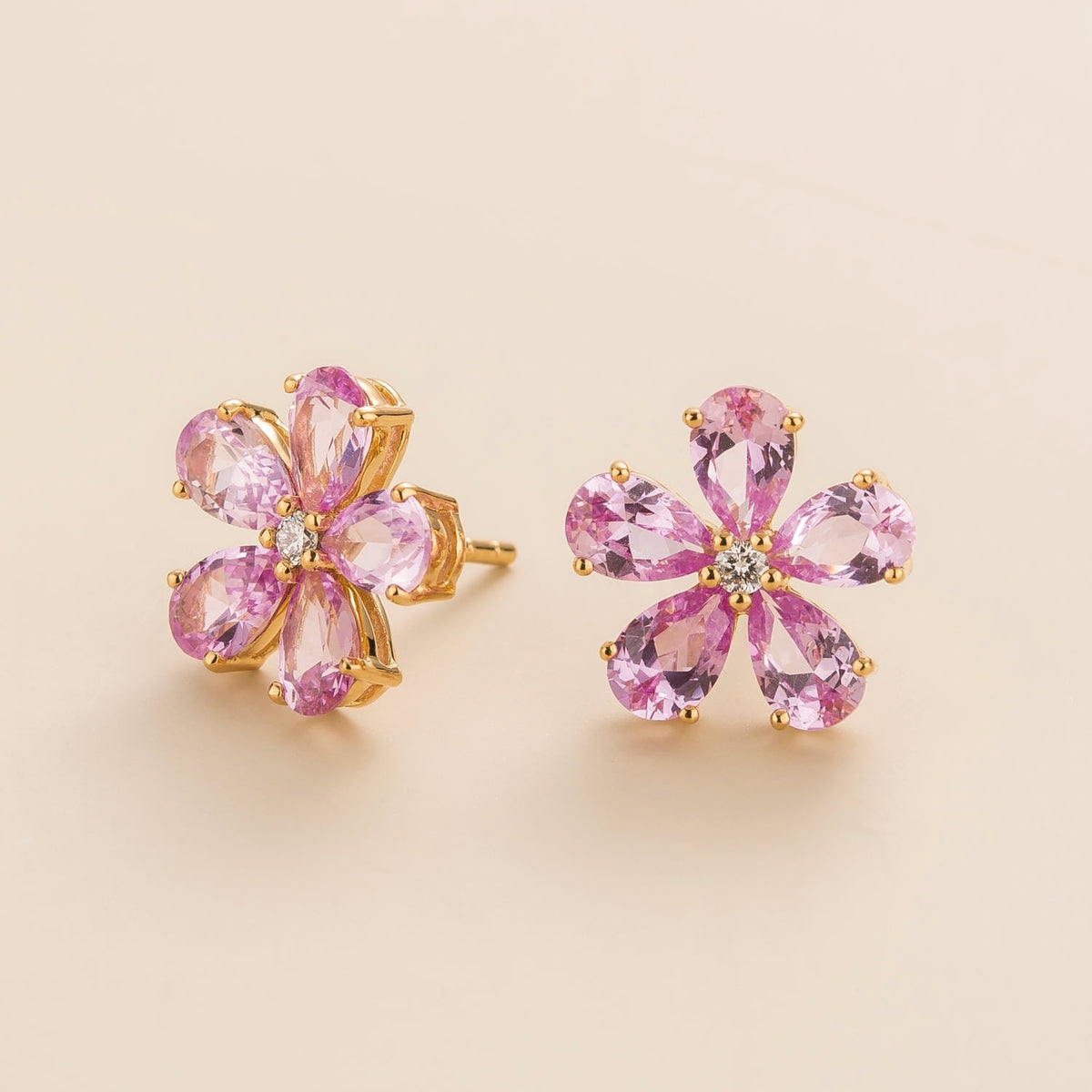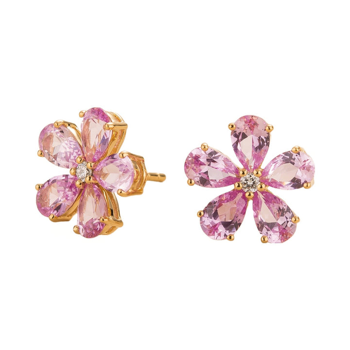 Crafted from 18K gold vermeil, these earrings are set with natural pink sapphires (~5.0 carats) and VS+ grade natural diamonds (~0.1 carats). Each earring measures 13.1mm in height, 13.4mm in width, and 3mm in depth.