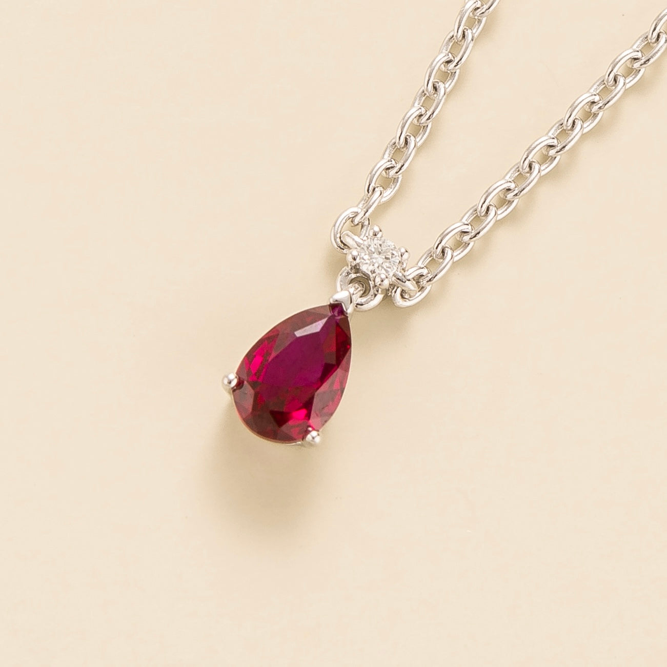 This necklace is crafted from 18K white gold vermeil and is set with a Ruby (0.51 carats) and a diamond (0.03 carats, DEF VS grade). The chain is 16-18 inches.
