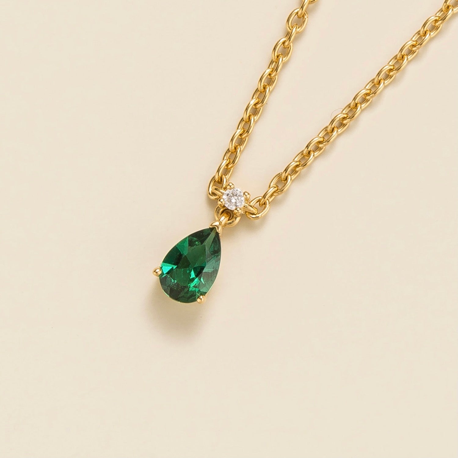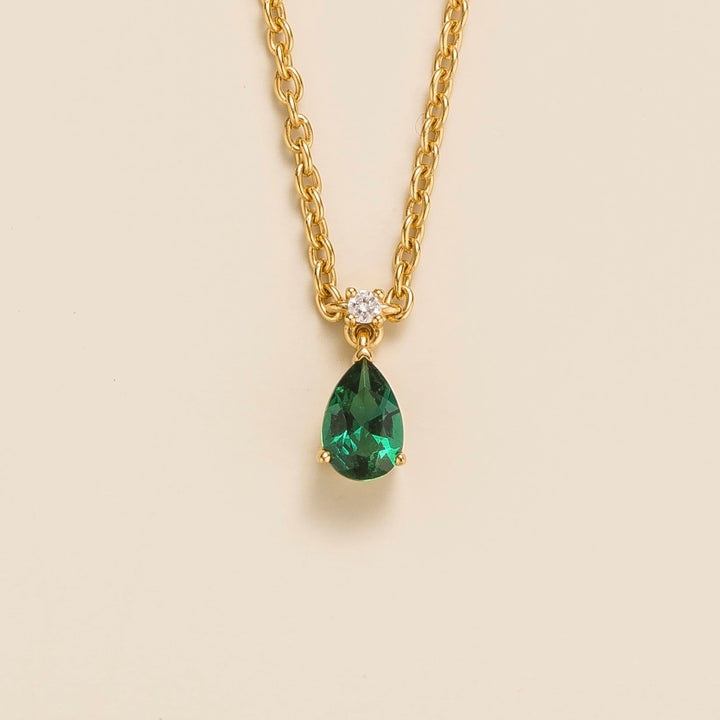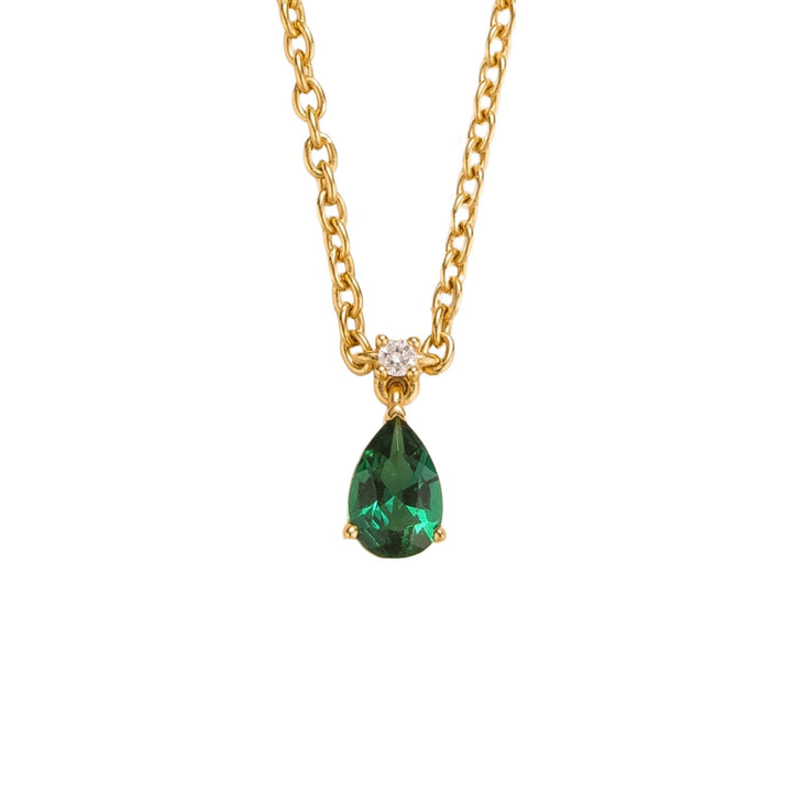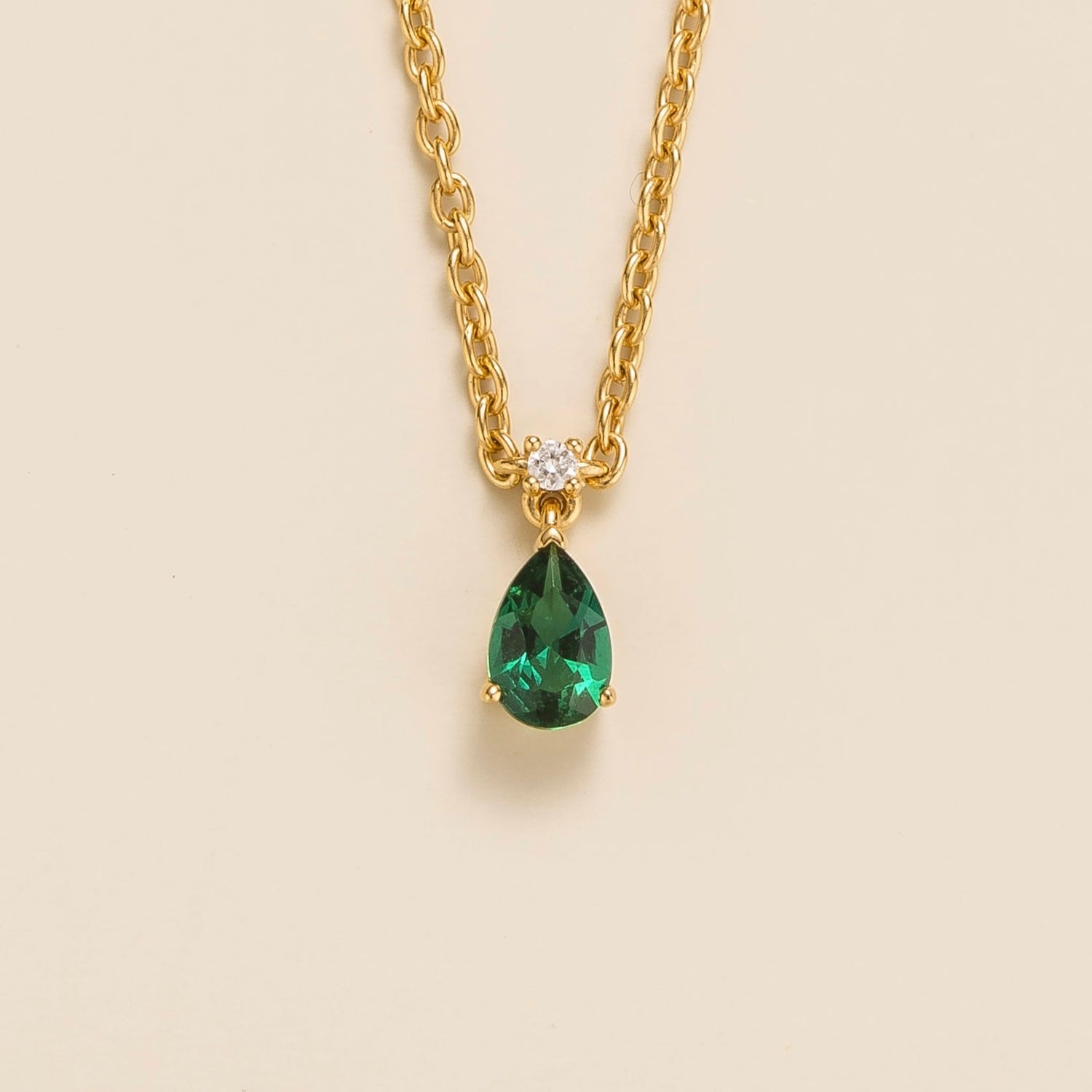 This necklace is crafted from 18K yellow gold vermeil and is set with an Emerald (0.35 carats) and a diamond (0.03 carats). The chain length is 16-18 inches.