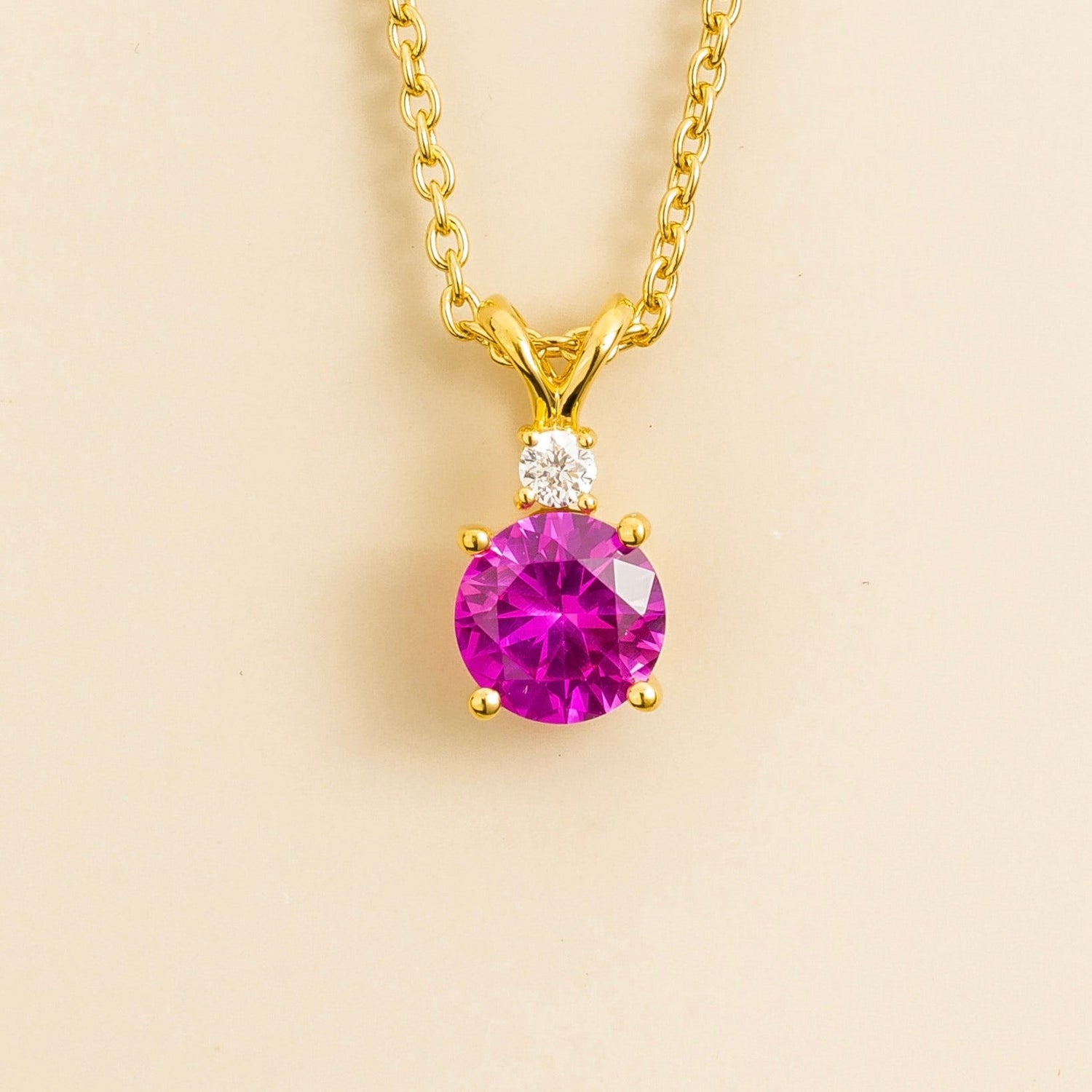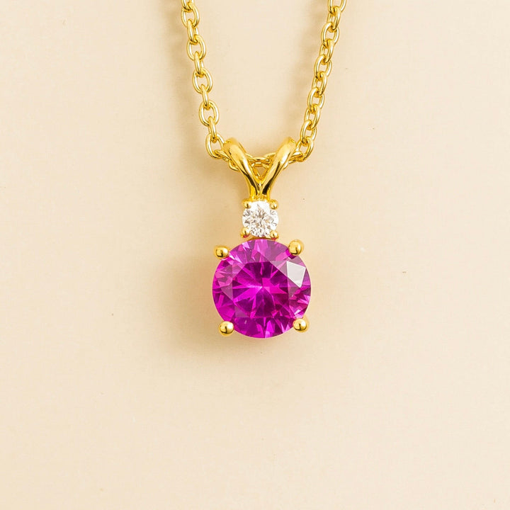 This necklace is crafted from 18K gold vermeil and is set with a Vivid Pink sapphire (~1.6 carat) and a diamond (~0.06 carat). The chain is adjustable from 16-18 inches.