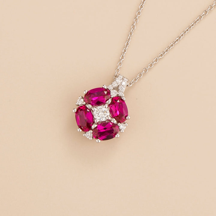 This necklace is made with 18K white gold vermeil. It is set with Diamonds (~0.26 carats) and Rubies (~2.4 carats). The chain is adjustable from 16 to 18 inches.